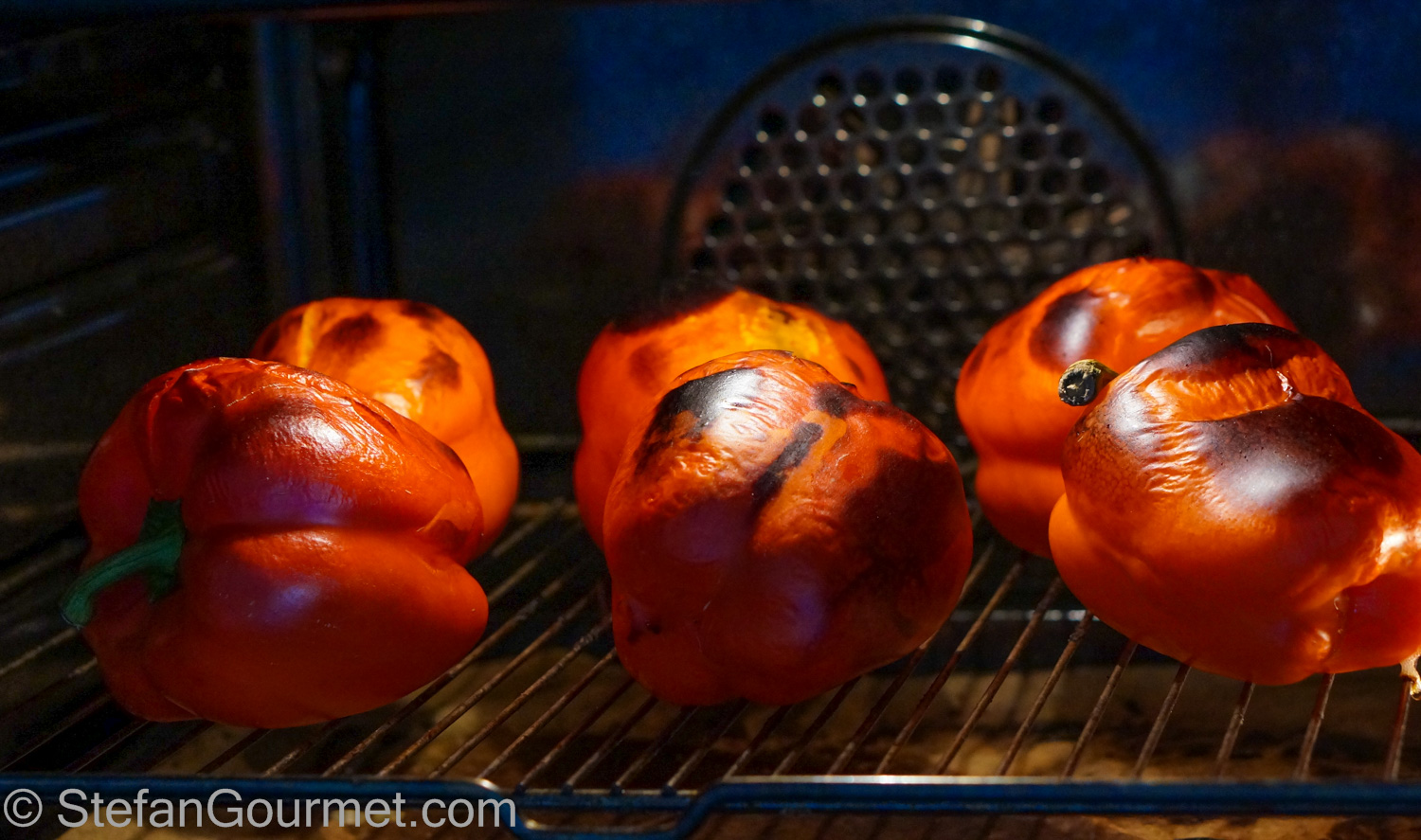 Start by roasting the peppers for 25 minutes in the oven at 250ºC/480ºF until they are charred.