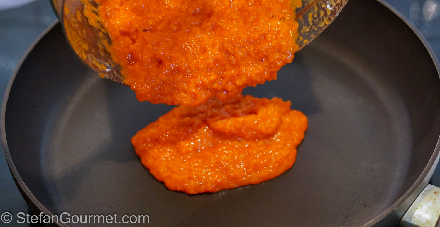 Put a non-stick frying pan over medium heat and add the bell pepper puree.