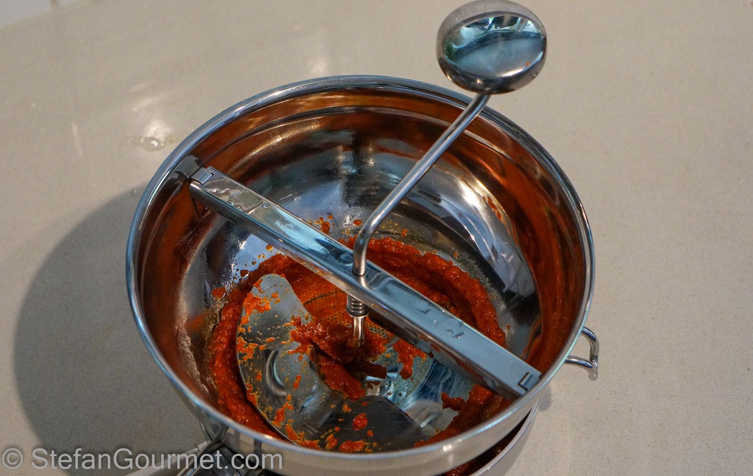 Pass the bell pepper puree through a food mill fitted with a fine disc to make it completely smooth.