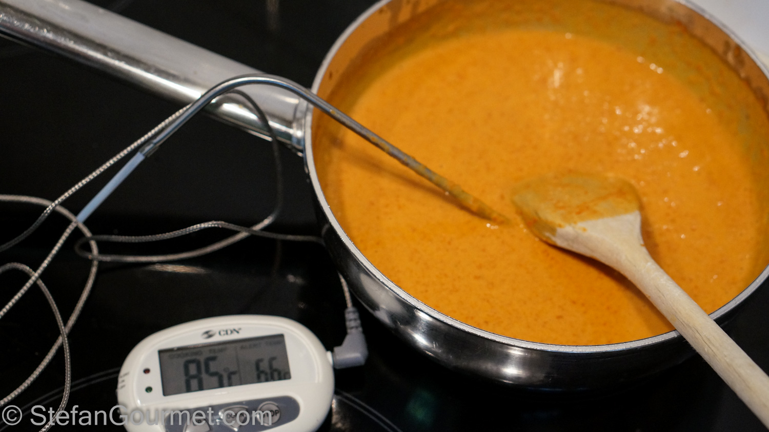 Heat this mixture, stirring all the time, until it reaches a temperature of 85ºC/185ºF. Then turn off the heat and allow the mixture to cool.