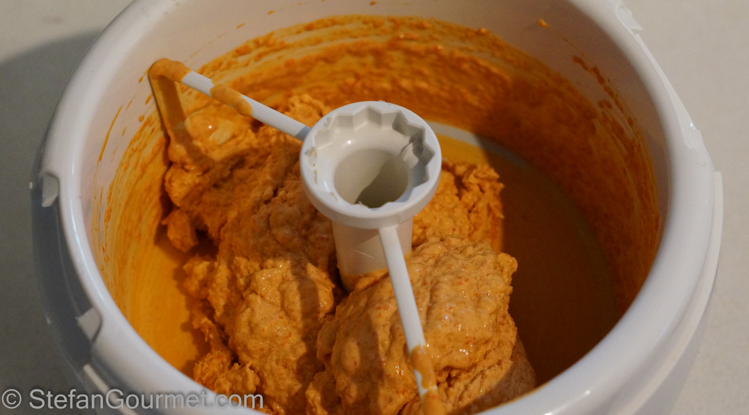 It is done when it is no longer watery, about 10 minutes. Taste and adjust the seasoning (using balsamic, sugar, salt, paprika, and cayenne pepper), taking into account on the one hand that the flavors will be diluted in the ice cream, but on the other that you don’t want to crowd out the bell pepper flavor either.
