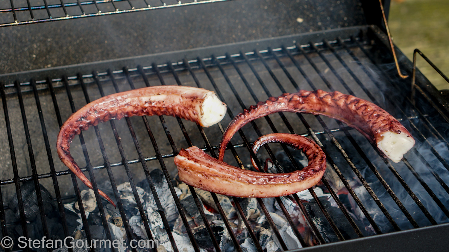 Cook the octopus legs over a hot charcoal fire until lightly charred.