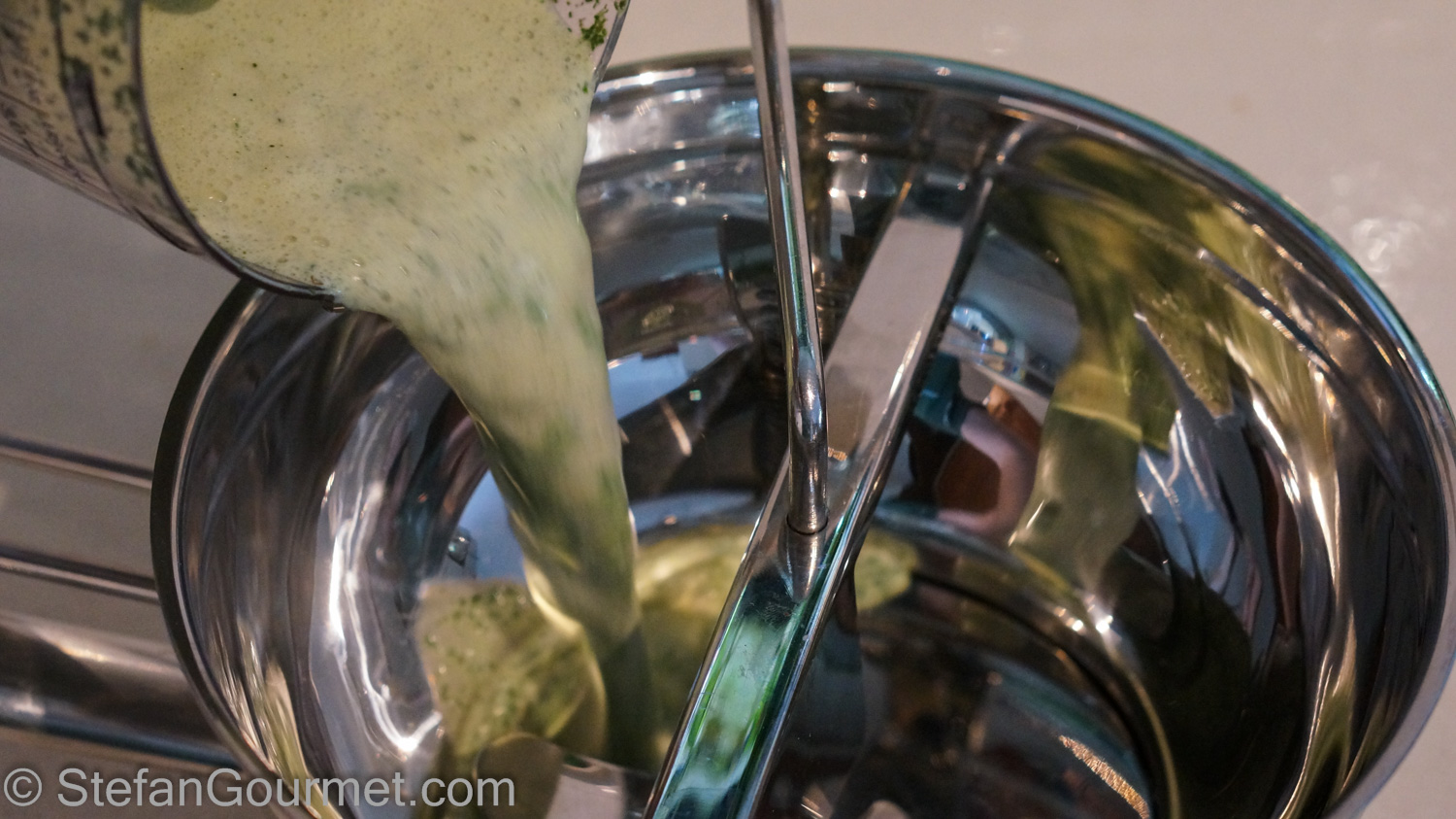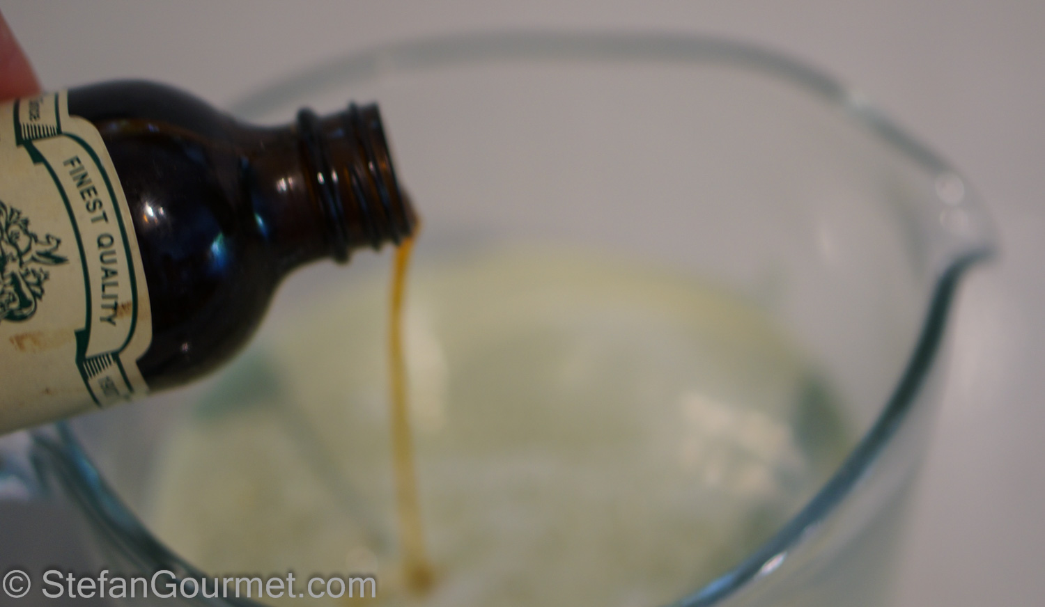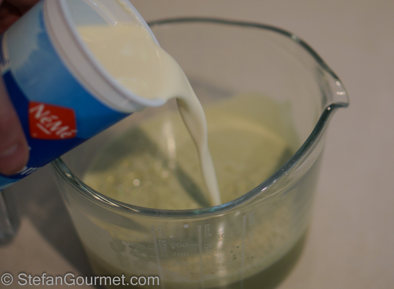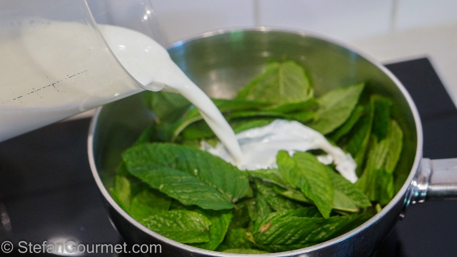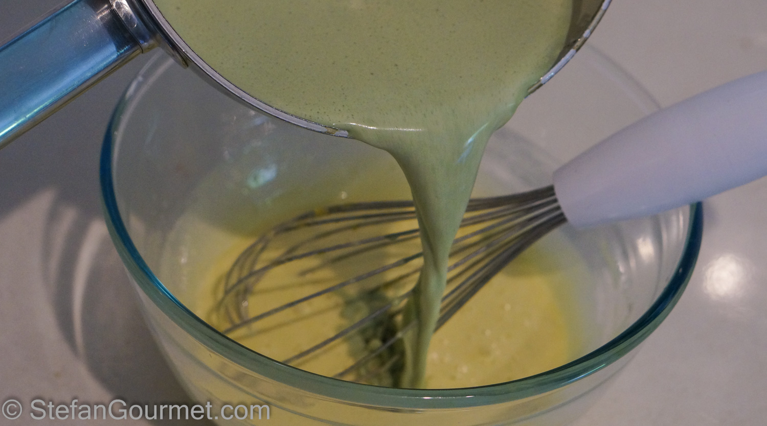 Add the mint-infused milk to the egg yolks and sugar (assuming that it in the meantime it has cooled off below 60ºC/140ºF so it won’t cook the egg yolks).