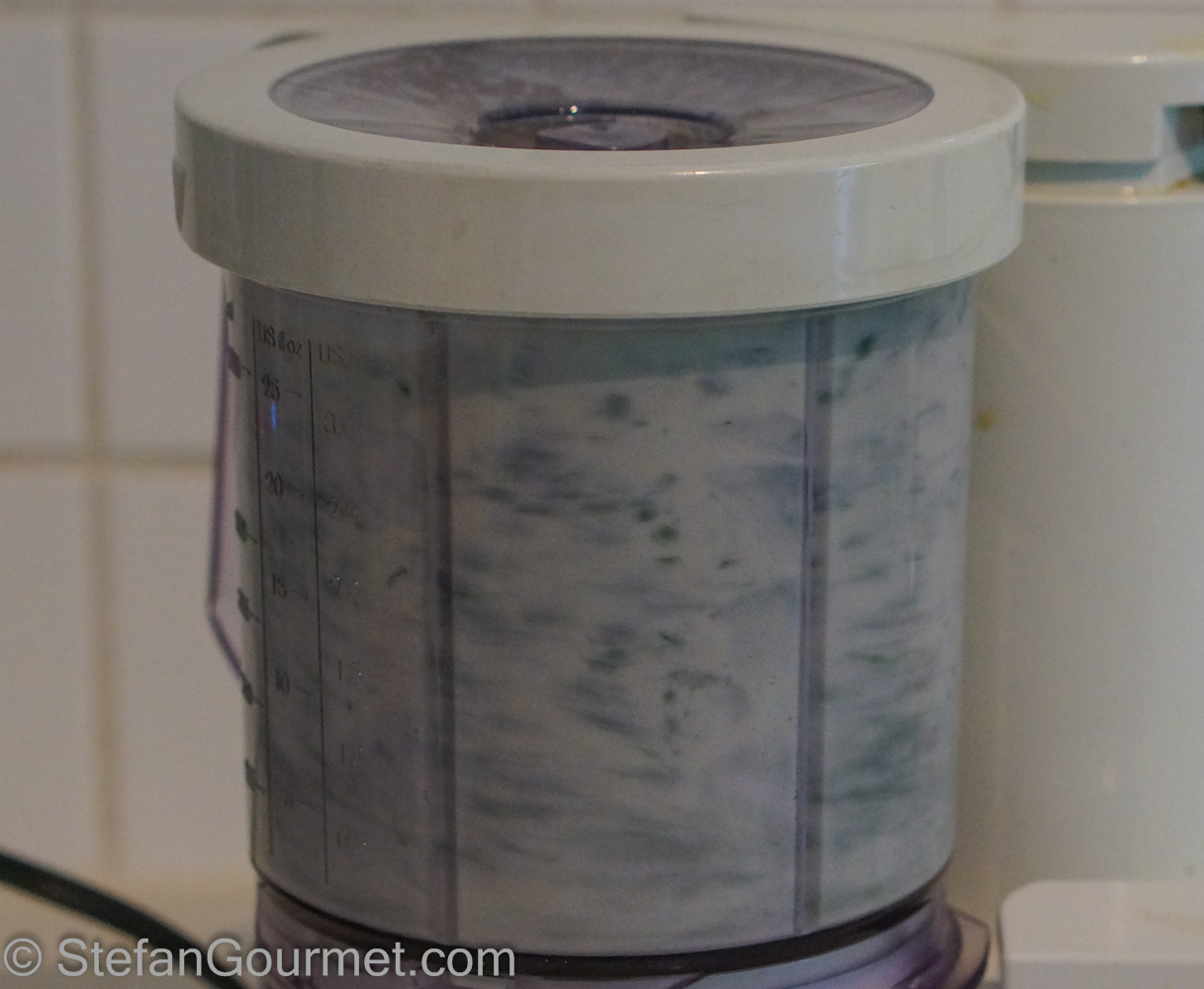 We have lots of mint growing in our garden, and I love mint ice cream (especially when combined with chocolate). So why not make mint ice cream from scratch? Mint ice cream is very refreshing and perfect for the summer. For the technique I used REMCooks’ recipe with some changes. Richard’s technique to extract the mint flavor from the fresh mint leaves works very well — thanks Richard! Otherwise it is mostly a standard custard ice cream recipe. Adding chocolate chips is optional, but recommended.