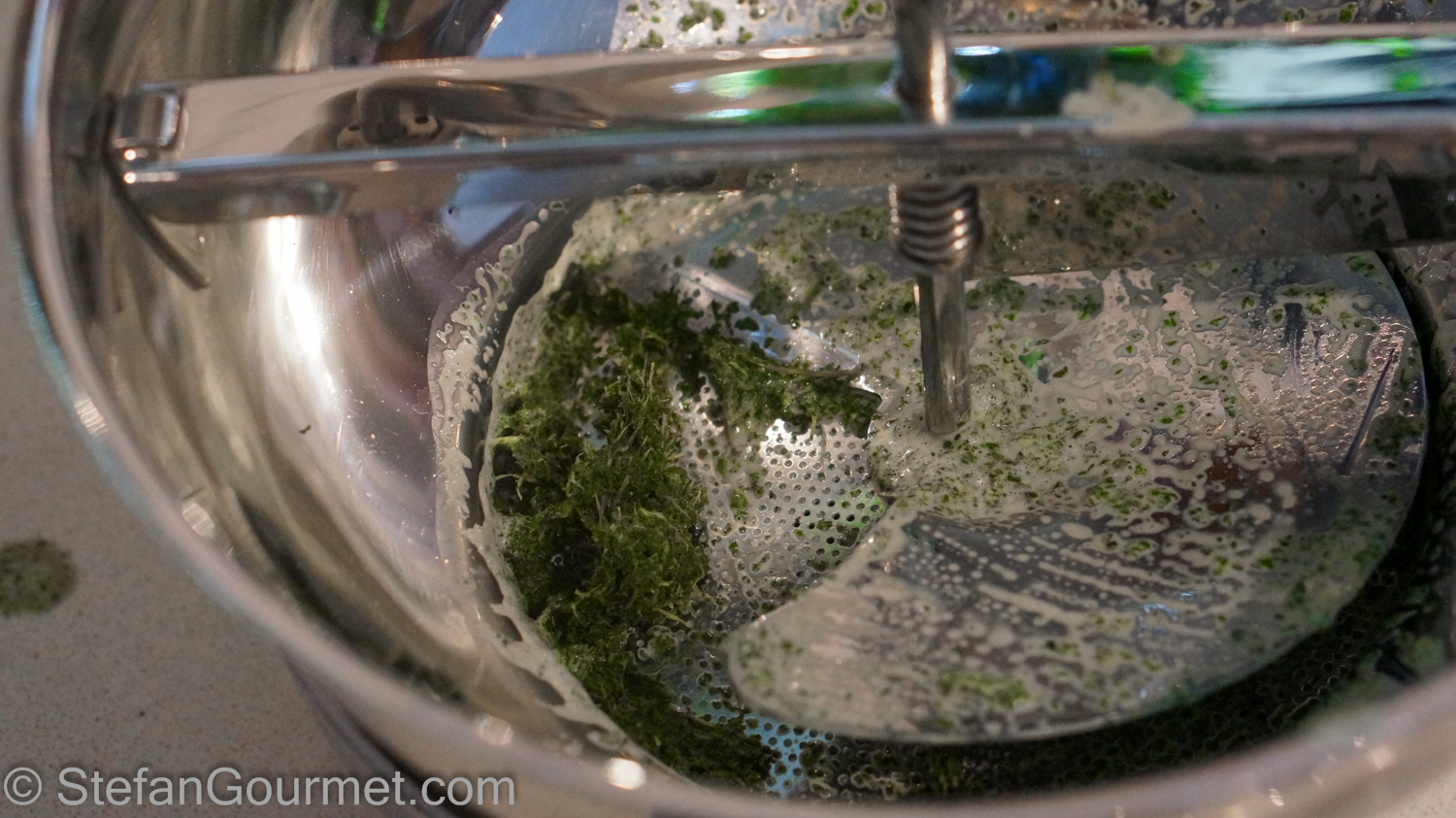 Extract the mint-infused milk using the foodmill, leaving behind the leaves.