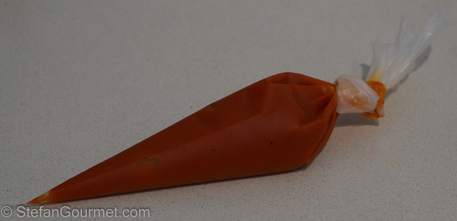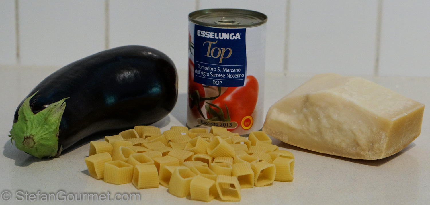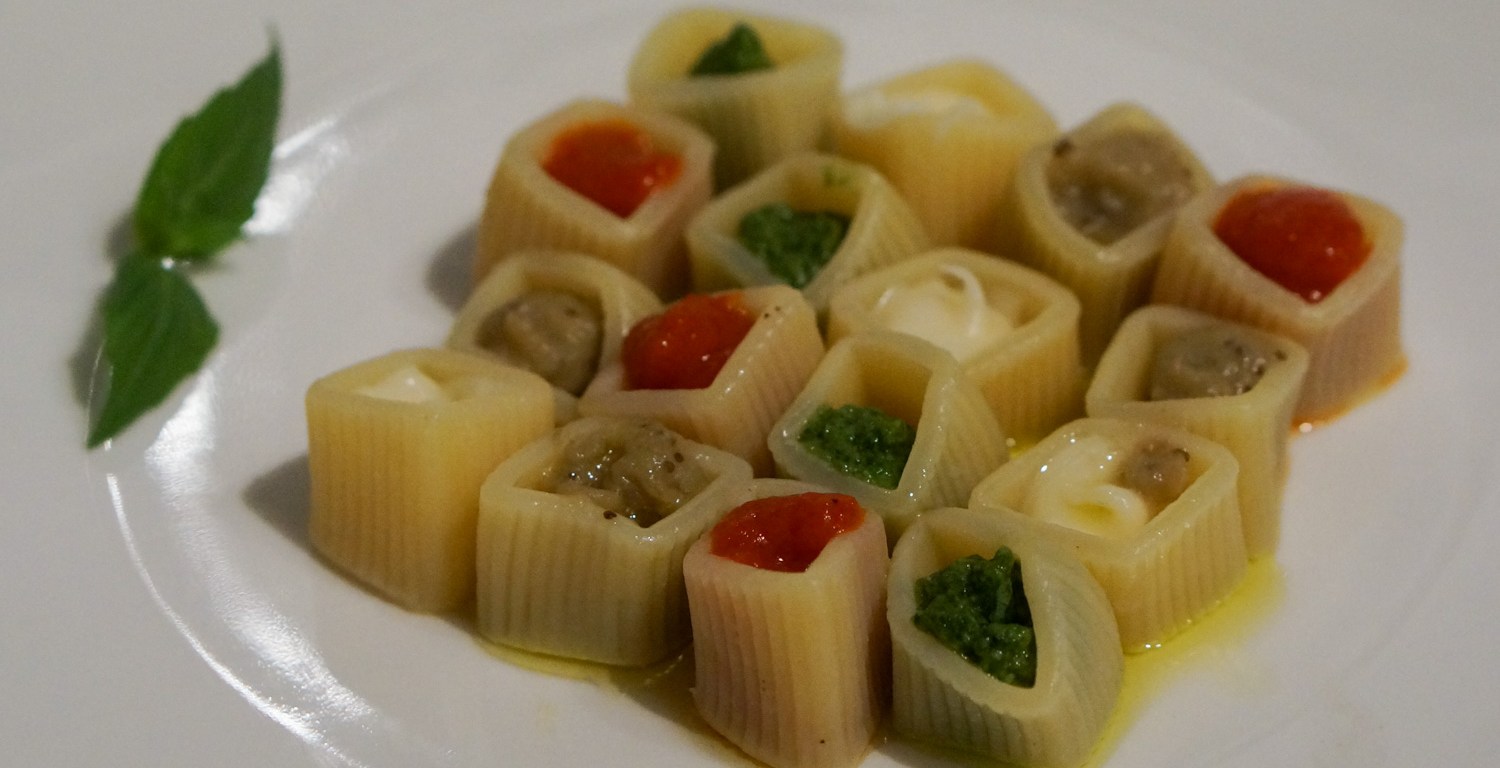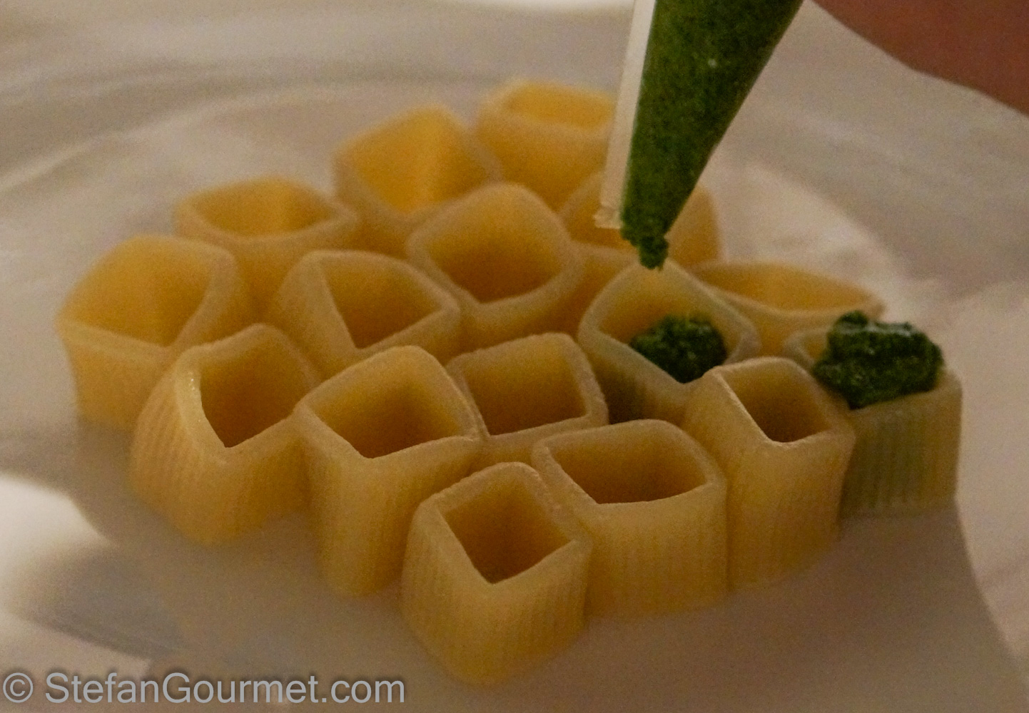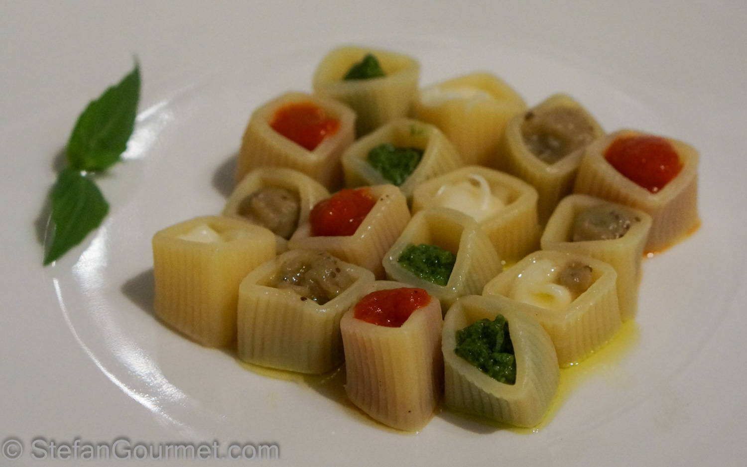 One of the goodies I brought from my trip to Italy was a new pasta shape: soqquadri or a square version of mezzi rigatoni. (If you can’t find the square version, you can also make this recipe with the usual round mezzi rigatoni or mezze maniche.) As a small primo piatto I decided to fill the soqquadri with ‘deconstructed’ eggplant alla parmigiana: pureed eggplant, tomato sauce, pesto, and parmigiano sauce. This makes for a very elegant presentation and it is delicious as well! It is mostly suited for small portions, as filling all the individual pieces of pasta would otherwise take too long. Disposable heat-resistant piping bags make life a lot easier, but it is still 16 pieces of pasta to fill per serving.