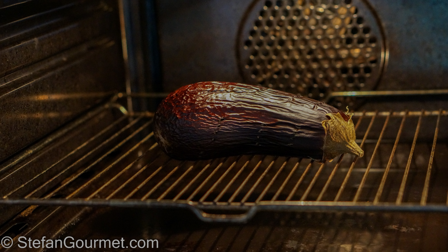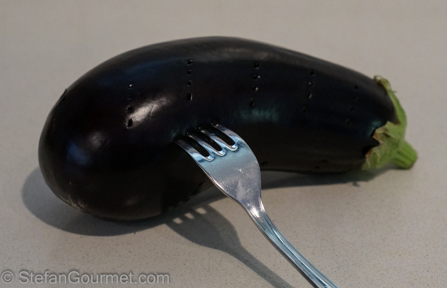 Preheat the oven to 225ºF/440ºF. Prick the eggplant on all sides with a fork.