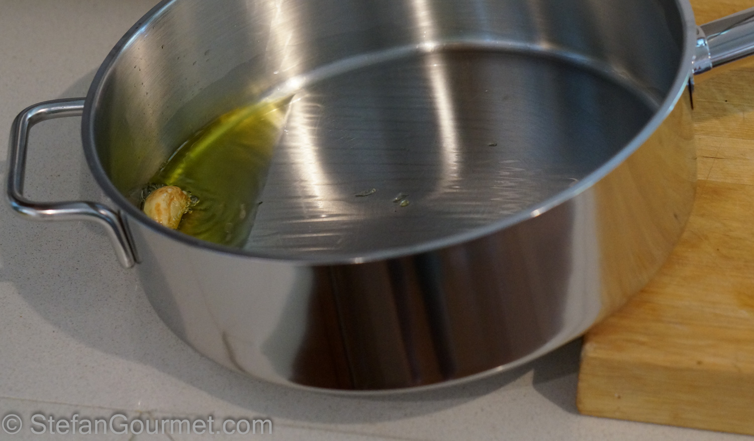 Meanwhile, heat the olive oil in a frying pan and add the garlic (whole). Once the garlic starts to sizzle, turn off the heat and tilt the pan (I like to let it sit on something so I don’t have to hold it.) Wait until the garlic turns golden, then discard it.