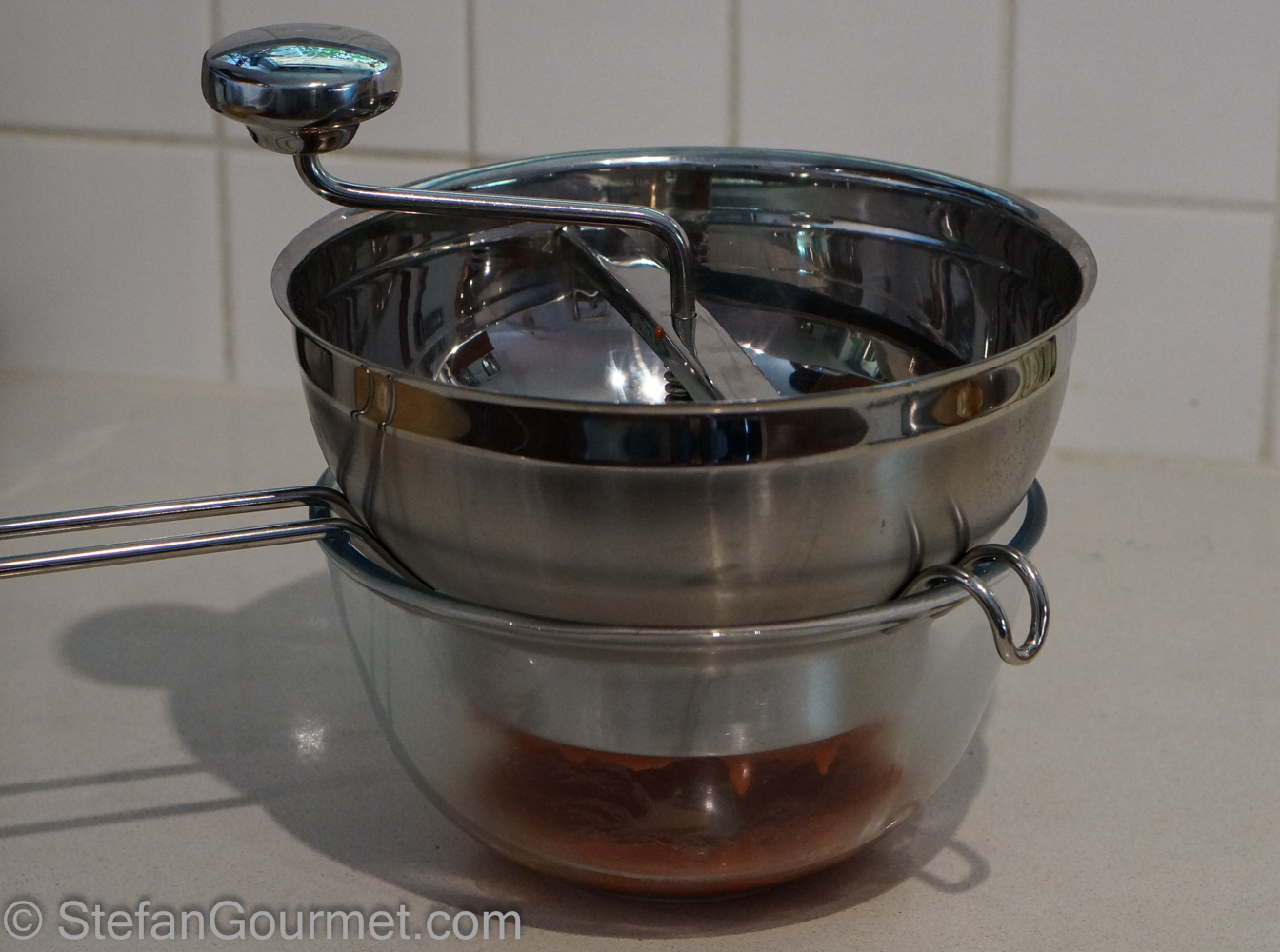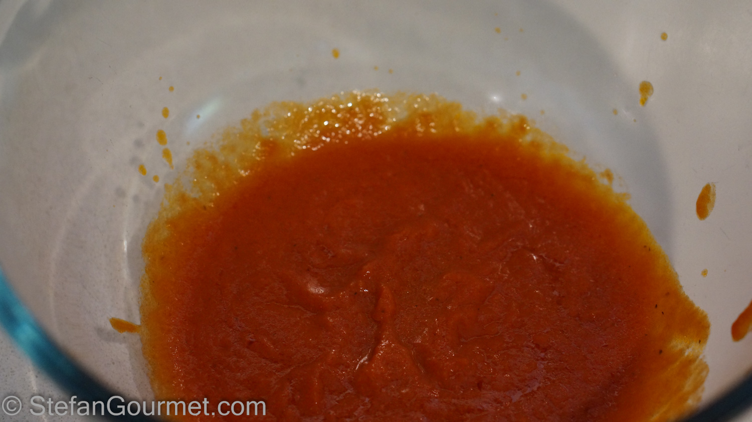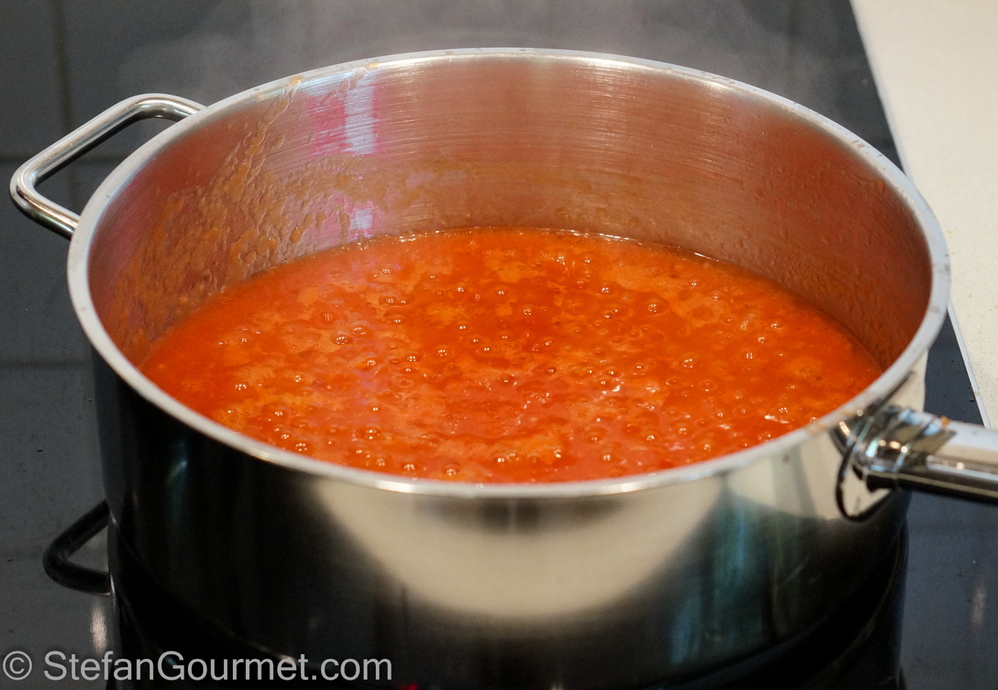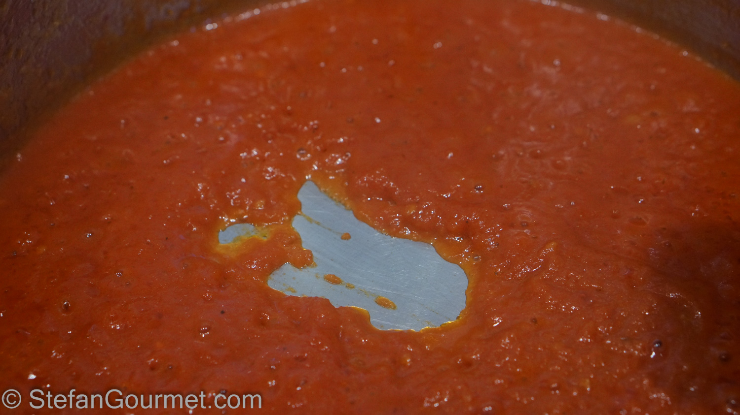 Simmer the tomato sauce until it is not watery anymore (which you can check by swiping some aside with a spatula; when it doesn’t ‘leak’ water anymore it is done).