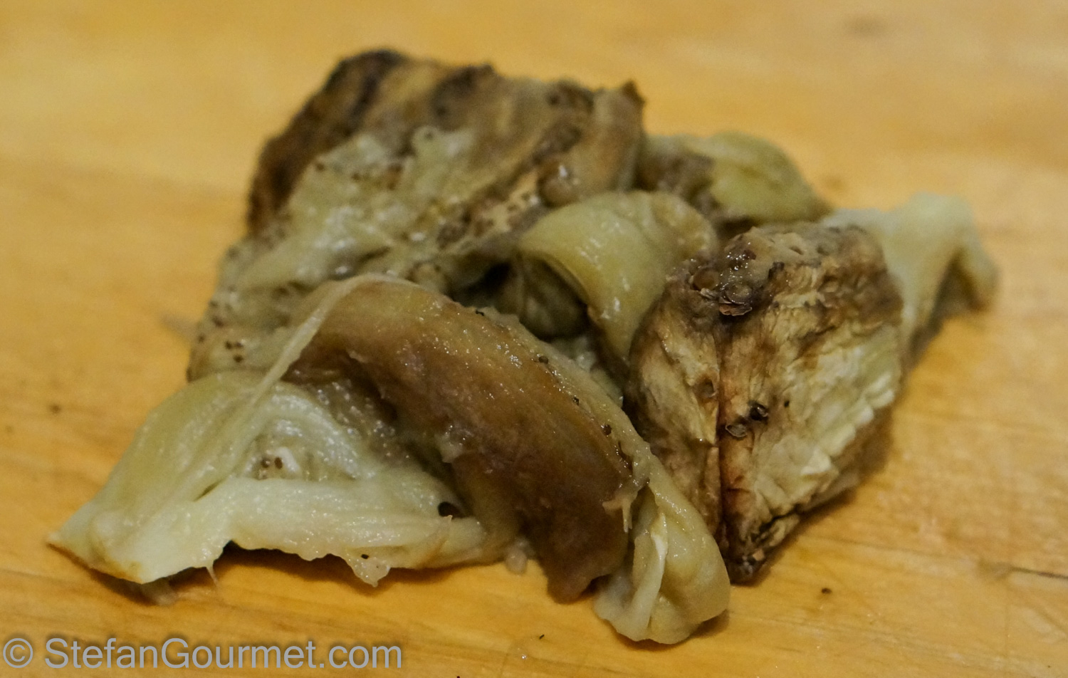 Once the eggplant is tender, cut off both ends. (Put the plates in the hot oven to warm them up.)