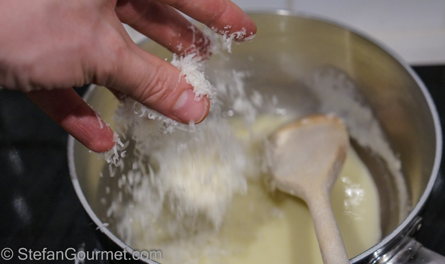 Add the parmigiano gradually, stirring each addition with a wooden spoon.