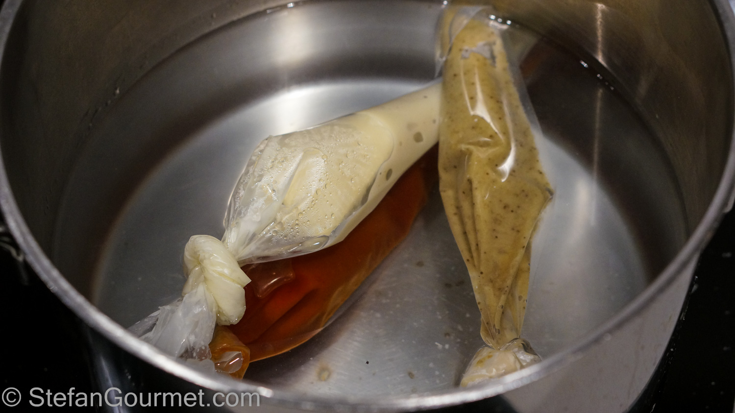 Meanwhile, warm up the parmigiano sauce, tomato sauce, and eggplant puree in hot water (about 70ºC/160ºF).