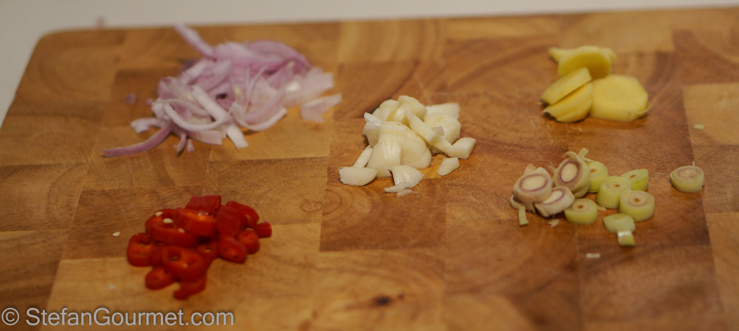 In most cases I plan what I am going to prepare for dinner and shop accordingly in advance, but for tonight I wanted to finish some leftovers I had in my fridge and created this dish. I had some Chinese cabbage (also known as Napa cabbage), shrimp stock, shrimp and shiitake mushrooms. I thought this would go nicely with some rice noodles and some Asian style seasoning: fresh chile pepper, shallot, garlic, ginger, and lemongrass.  I took photos just in case it turned out well, and it did! It only needed a bit of lime juice and a bit of soy sauce, then it was delicious. The shrimp stock provides great depth of flavor and the combination of ingredients works well. Here’s what I did…