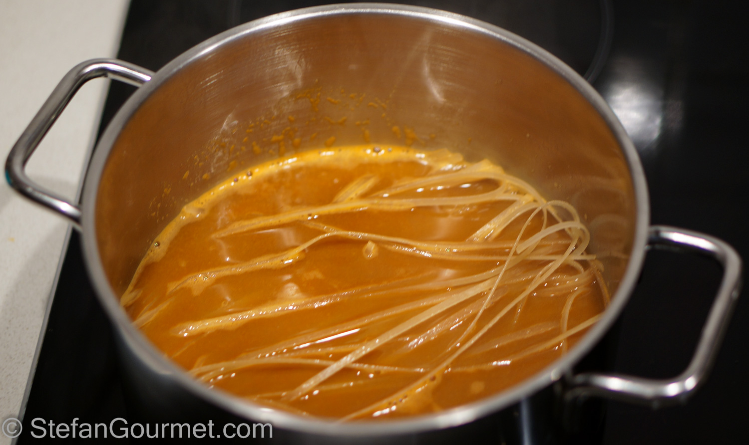 Add the rice stick noodles and allow them to soften in the hot shrimp stock.