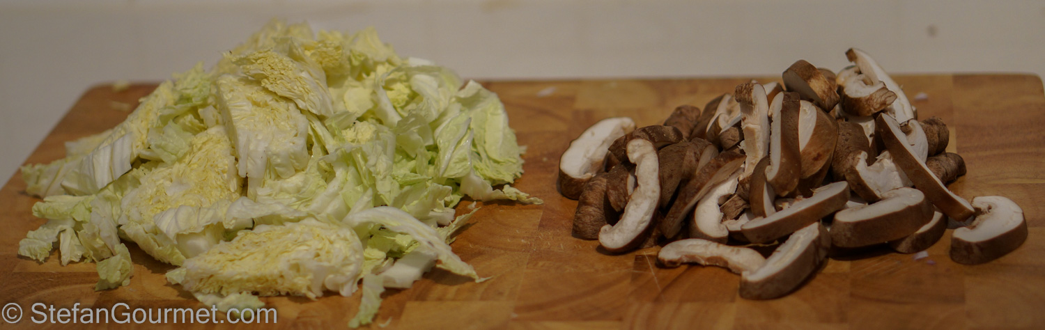Cut the cabbage into ribbons and slice the shiitake mushrooms, removing the stems first.