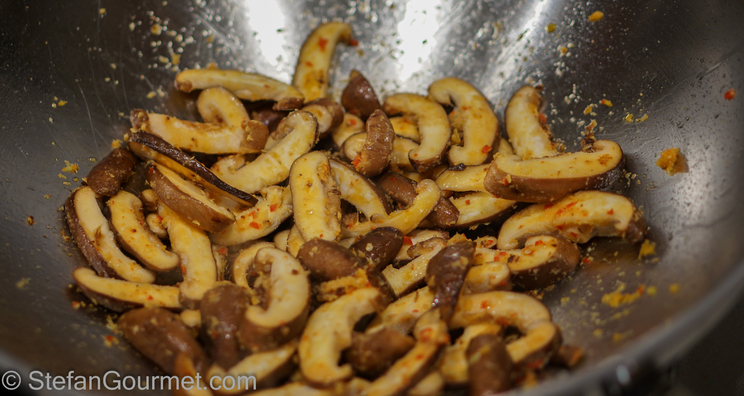 Add a few ladles of the shrimp stock and cook until the mushrooms are tender.