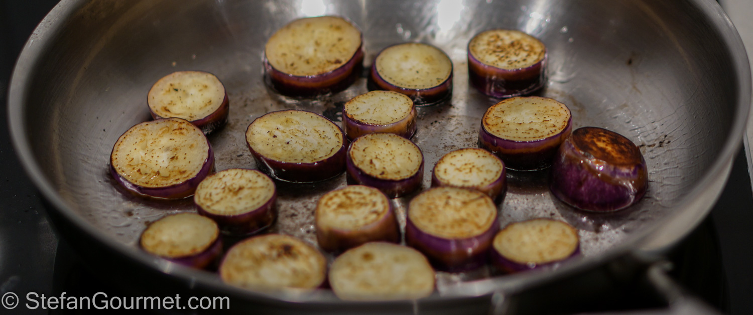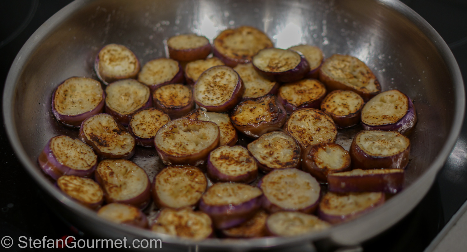 Heat 4 Tbsp vegetable oil in a frying pan and brown the eggplant slices for 3 minutes on each side, seasoning the eggplant with salt. Do this in batches when your frying pan is not big enough.