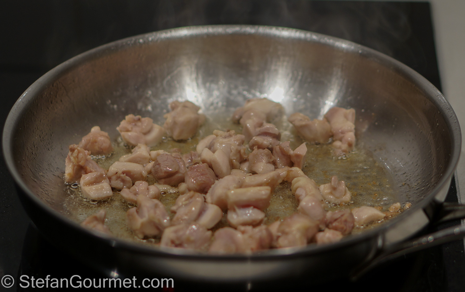 Season the chicken with salt. Heat the remaining 2 Tbsp vegetable oil in a frying pan and add the chicken. Stir-fry until the chicken has lost its raw color on all sides. Take it out of the pan with a slotted spoon and set aside.