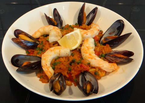 This is my take on seafood paella. Not completely traditional, but nicely presented and very tasty.