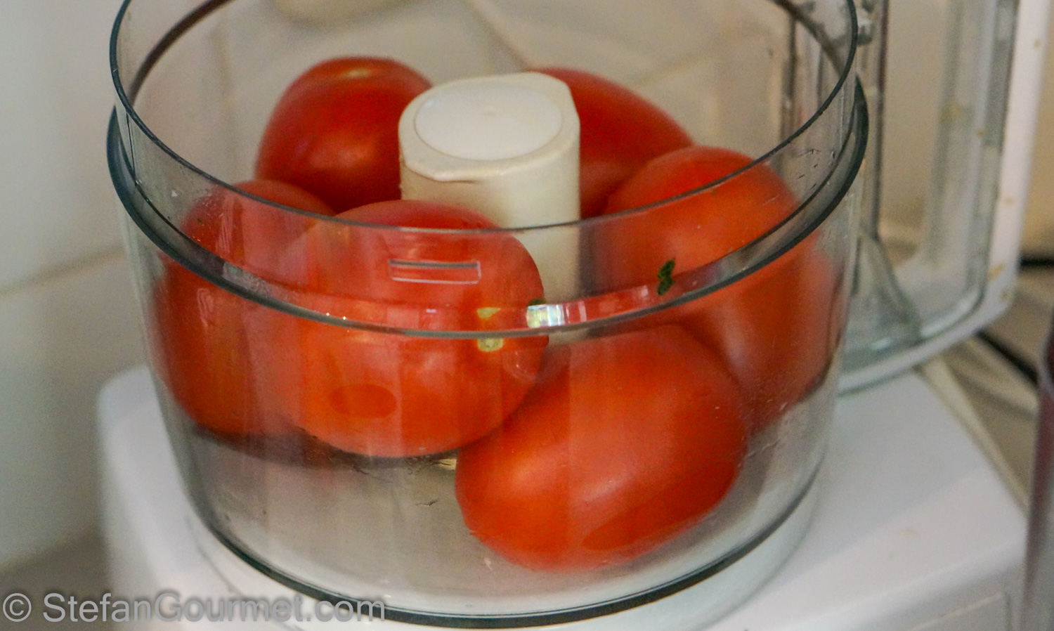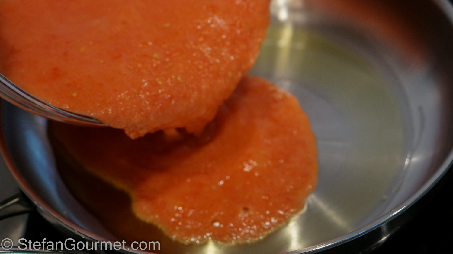 Heat the olive oil in a frying pan. Add the tomato pulp.