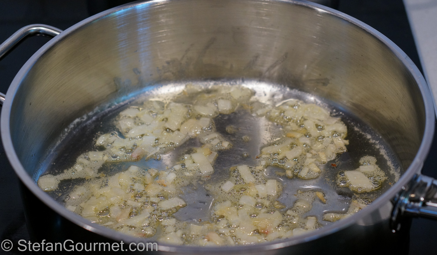 Meanwhile, in a thick-bottomed pan melt 2 Tbsp of the butter over medium heat and add the onion. Sauté the onion until soft and fragrant, about 5 minutes.
