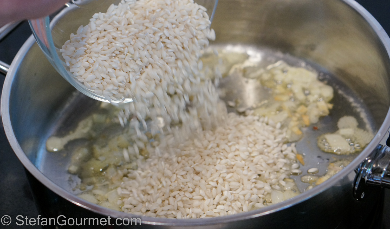 Add the white wine and cook over medium heat until the wine has almost completely been incorporated into the rice.