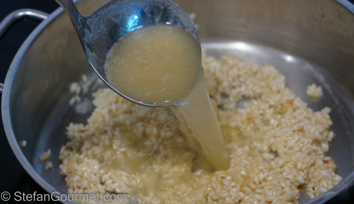 Add a ladle of stock and cook, stirring constantly, over medium heat until it has been absorbed. Keep adding stock ladle by lade and keep stirring until you have run out of stock. The rice should still be somewhat undercooked. Turn off the heat.