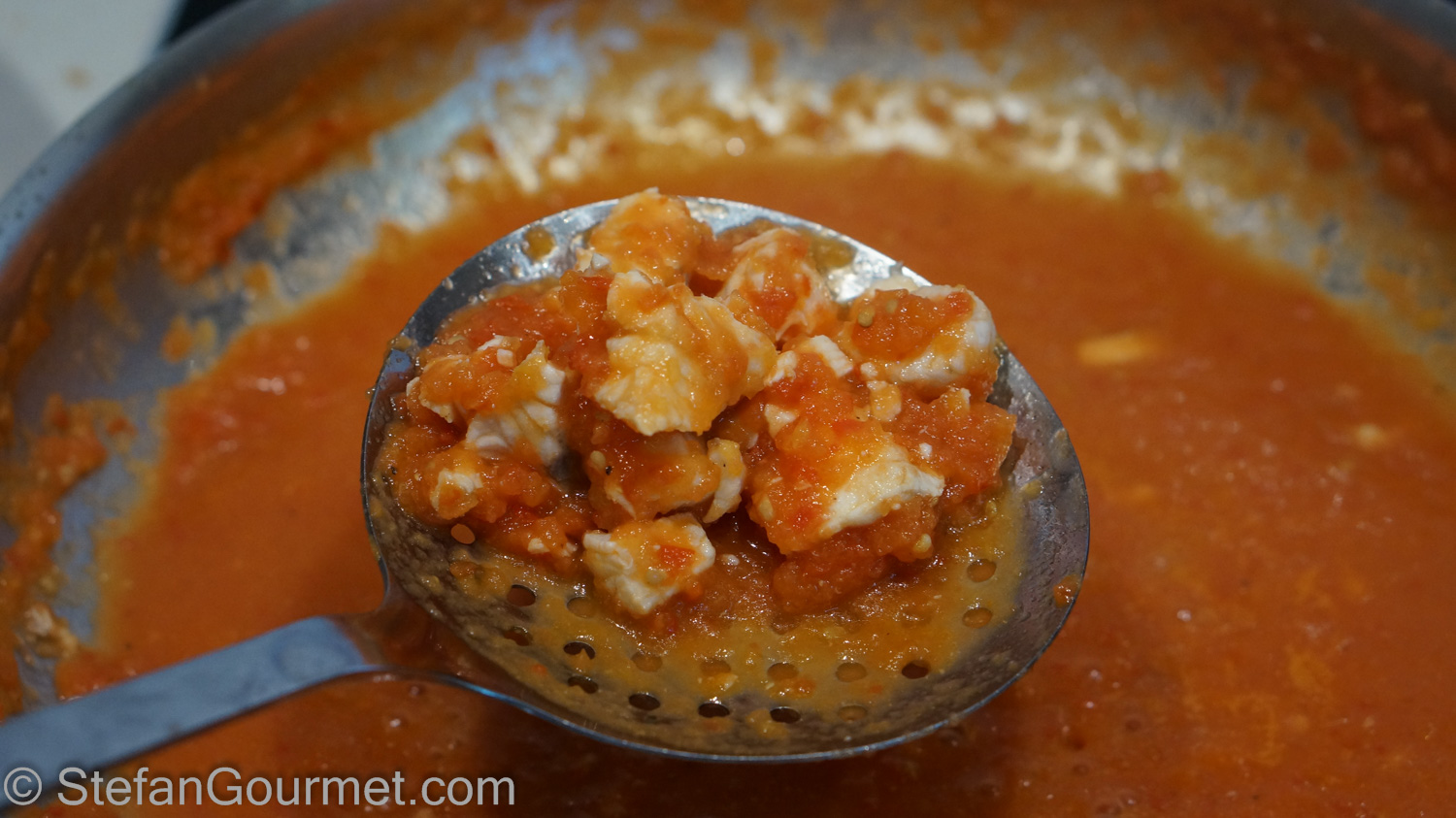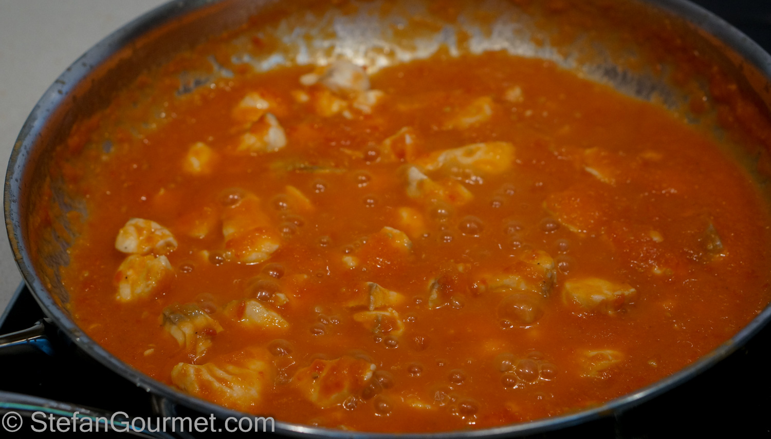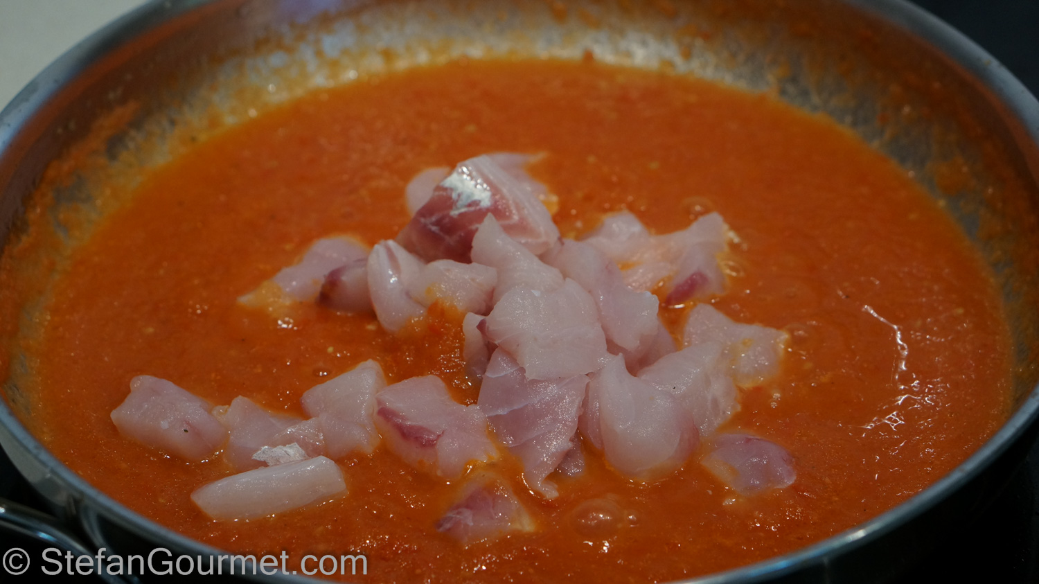 Now add the fish to the tomato sauce, which should be ready by now. (If it was ready too early, turn off the heat and then bring it to a boil as soon as you’ve finished adding all of the stock to the rice.)