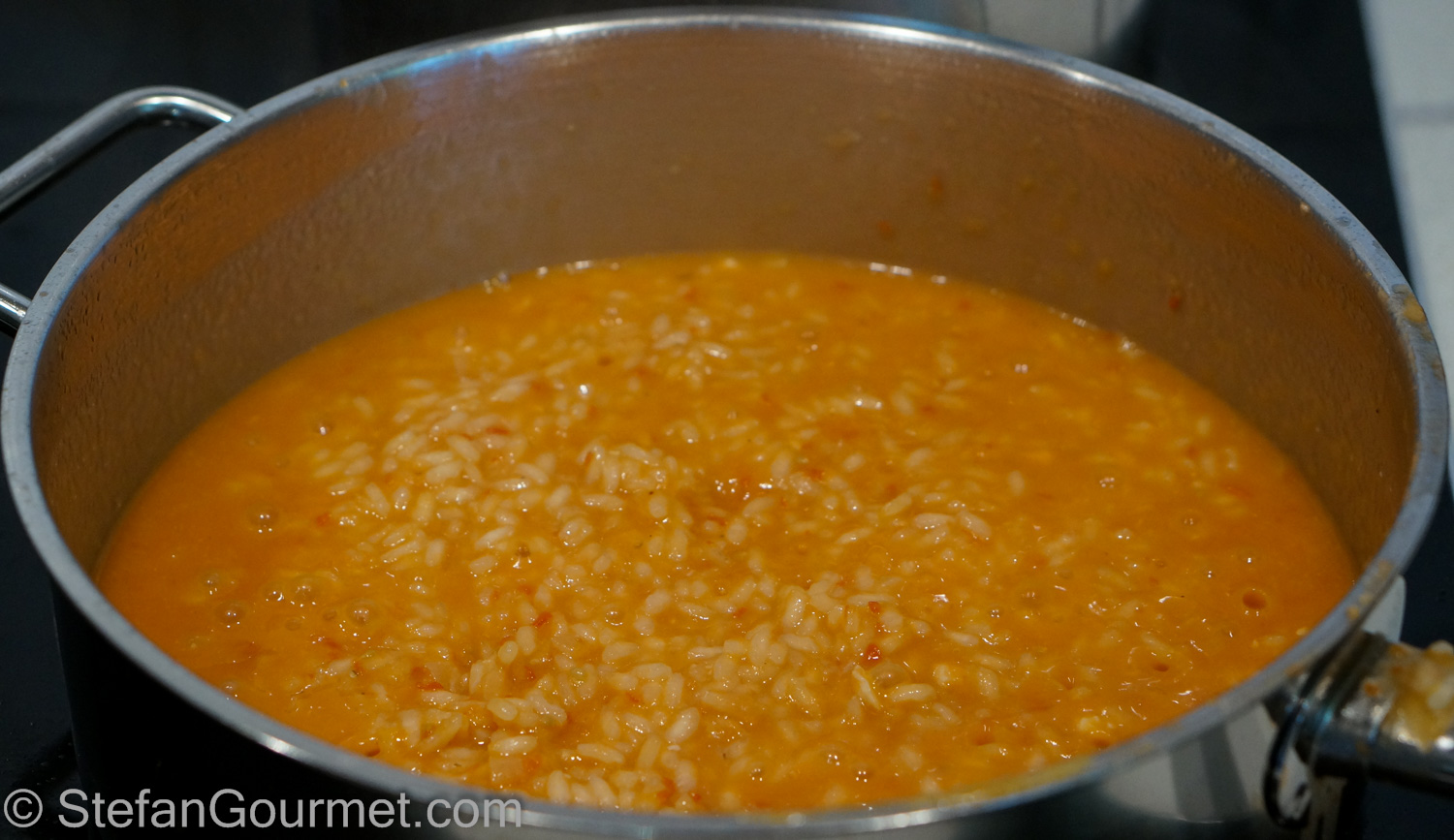 Marinara sauce is the American-Italian term for tomato sauce, but in Italy it usually refers to a sauce prepared in the style of  the seaman’s wife and is a tomato-based sauce with seafood. I really liked the risotto alla marinara I had at Ristorante Anna in the Adriatic beach town Gabicce Mare, and decided to recreate something similar at home.