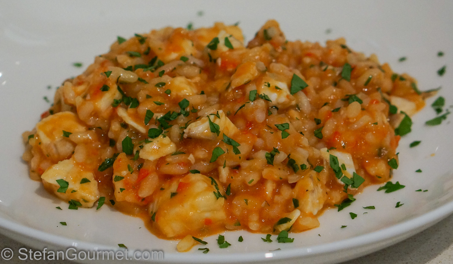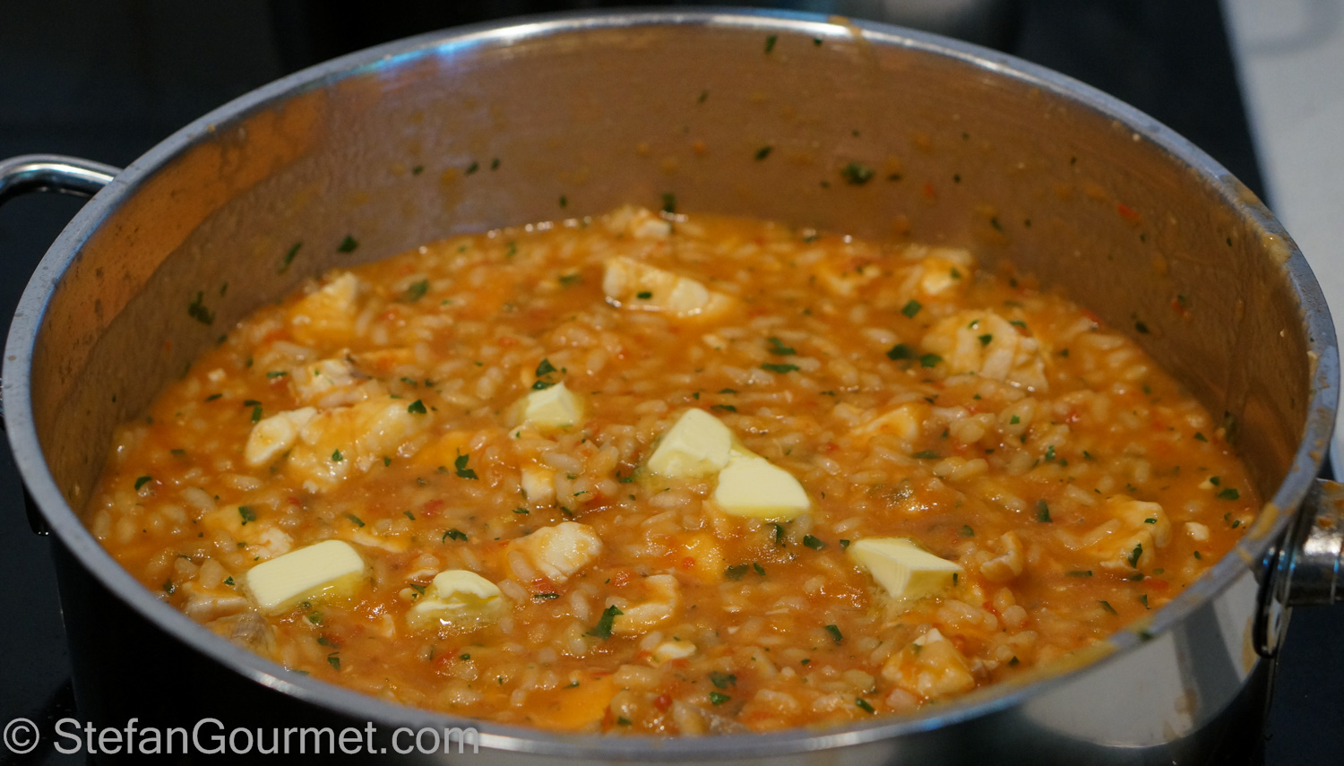 This is the risotto at Ristorante Anna, which was served without parsley and with the fish served on top, cooked until it was very flaky. I kept the fish in moist morsels instead. Otherwise I kept it very simple, just like the risotto at Ristorante Anna. Rice, fish, fish stock, and tomatoes are the main ingredients apart from the risotto standard ingredients onion, white wine, and butter. The fish stock at Anna included shrimp shells for more depth of flavor, and I copied that as well. Here’s what I did.