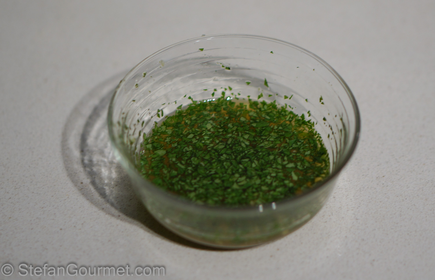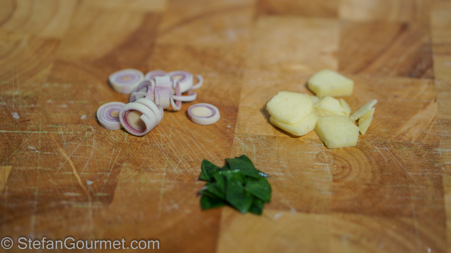 In this cases I cooked a baby sole with Thai flavors, and served it with a Thai dressing. Since I used a whole sole with the bones still in, I cooked it at 50ºC/122ºF to make it easy to get the fish off the bones. For sole fillets a lower temperature would be sufficient. It was easy and delicious, and done in 20 minutes. Here’s what I did…
