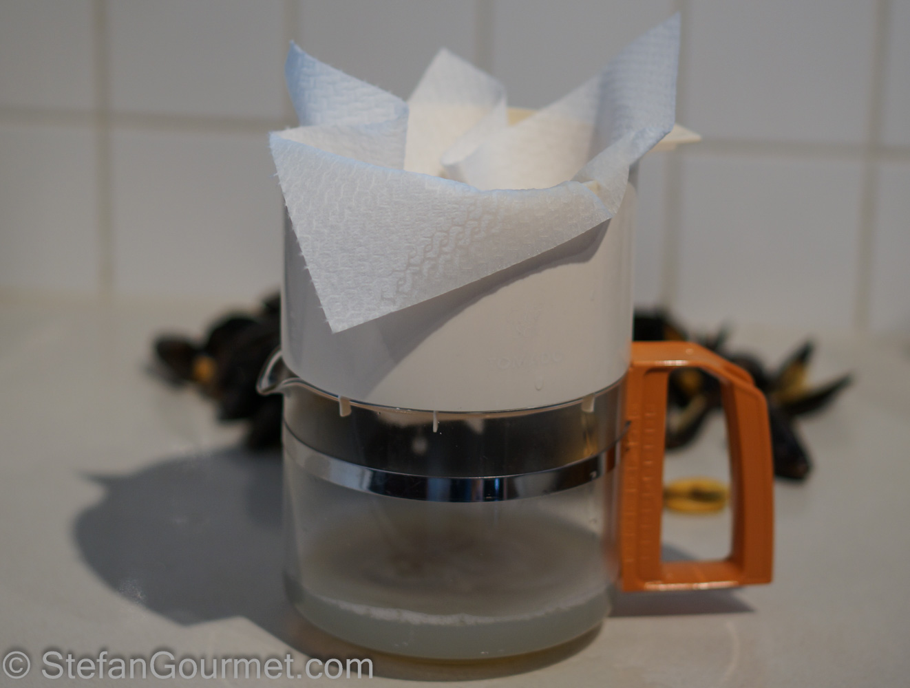 Filter the mussel liquid with kitchen paper or cheese cloth.