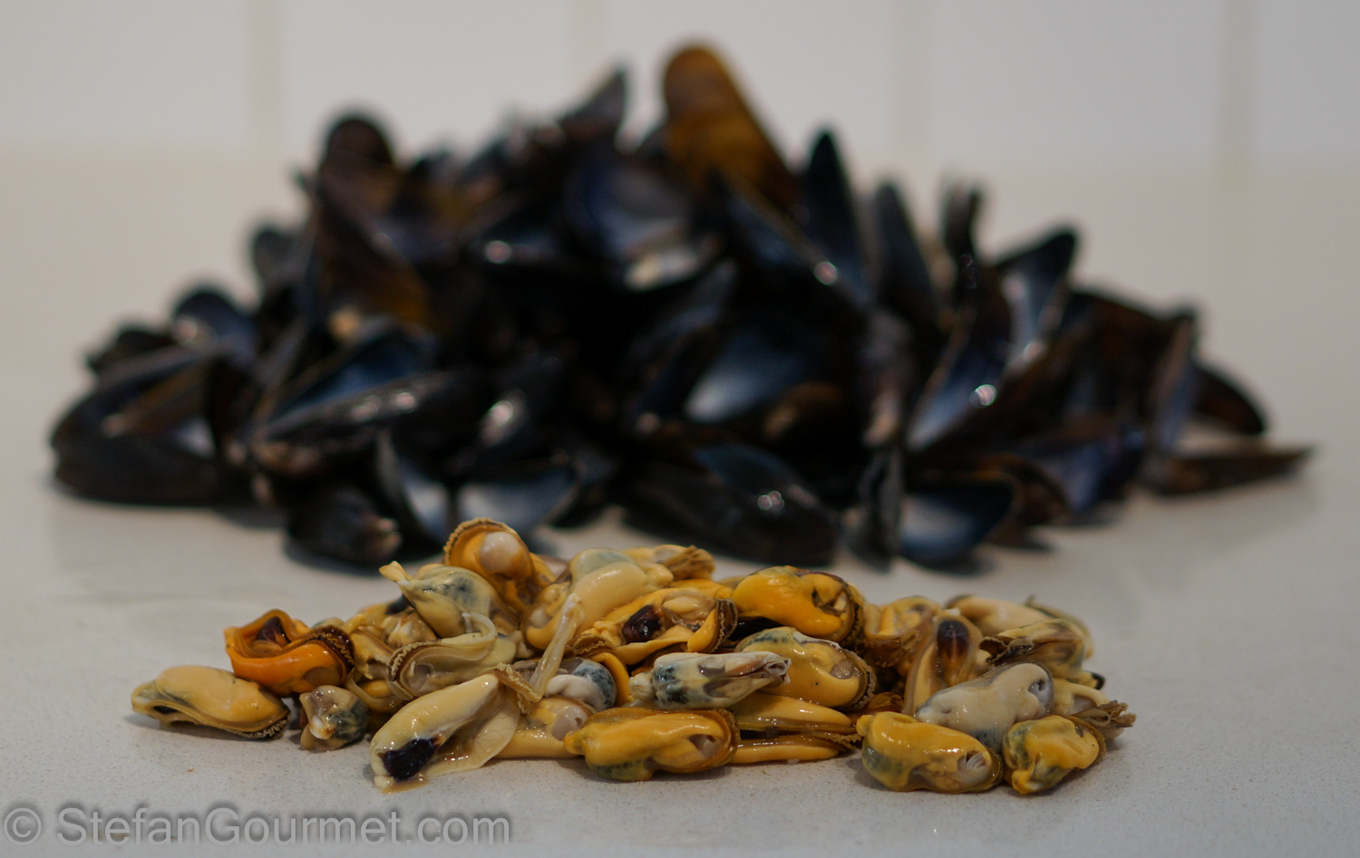 Allow the mussels to cool off until you can handle them, then take the mussel meat out of the shells. Keep some mussels in the shell for decorating the plate.