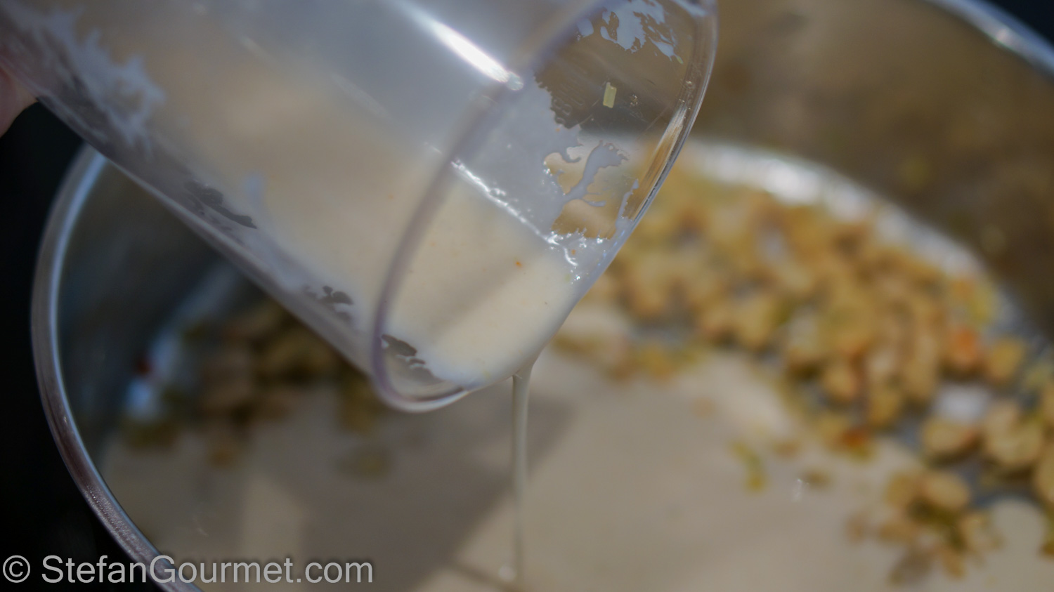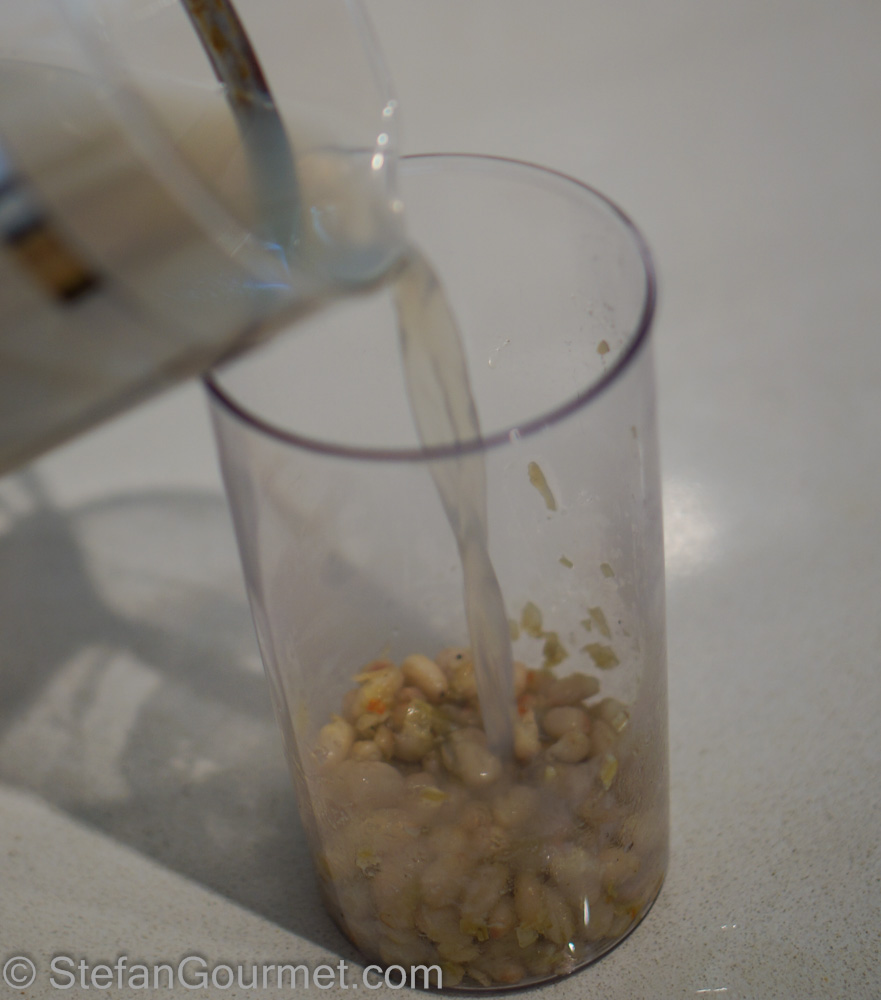 Once the beans have absorbed the flavors of the onions, garlic and chili, take half of them out and cover them with the filtered mussel liquid.