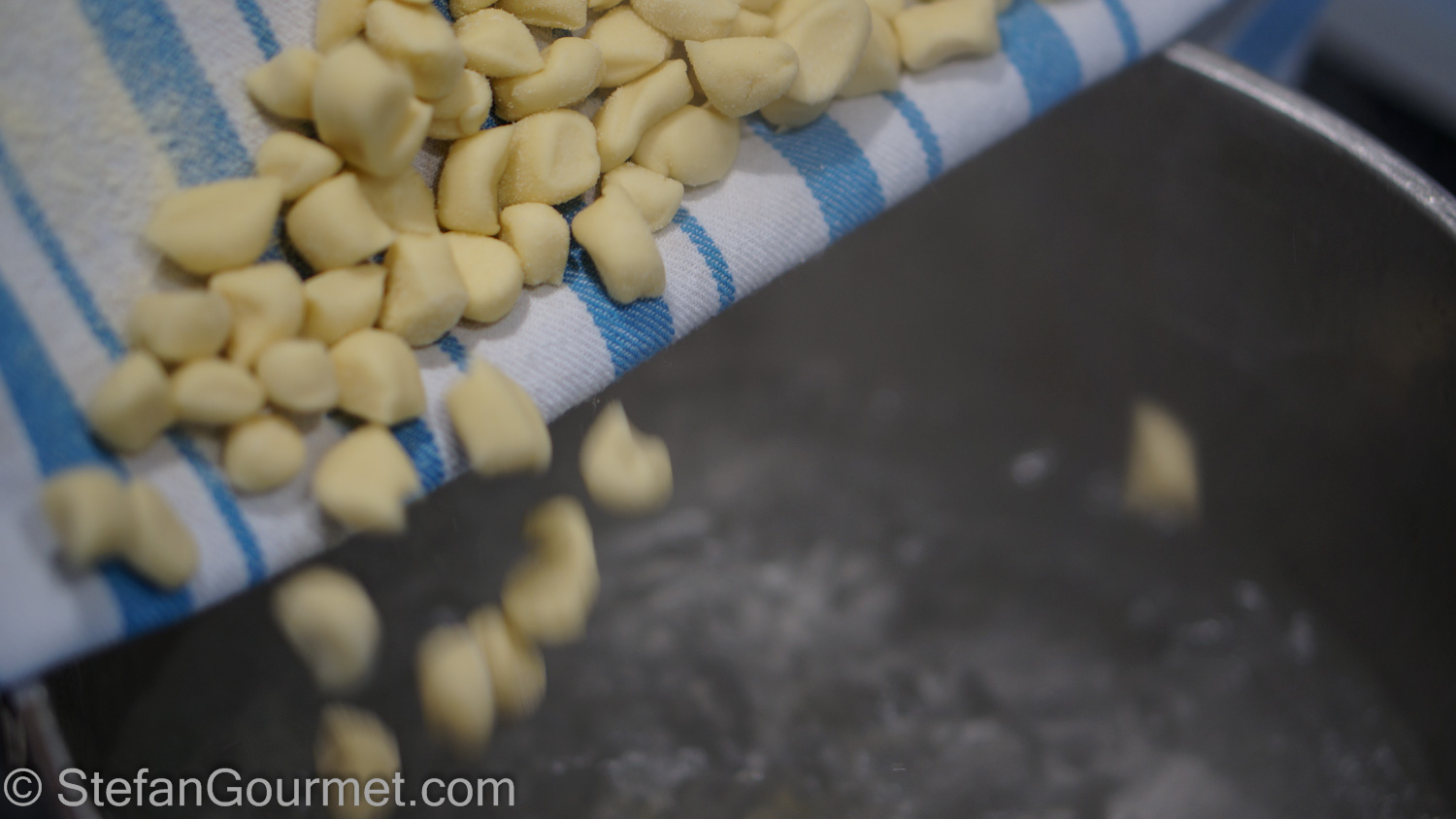 Cut the sausage into dumplings. Officially you are supposed to put grooves on them using a fork or a wooden gadget with ridges that Italians use for this, but that isn’t really necessary. Repeat until you have used up all of the dough.