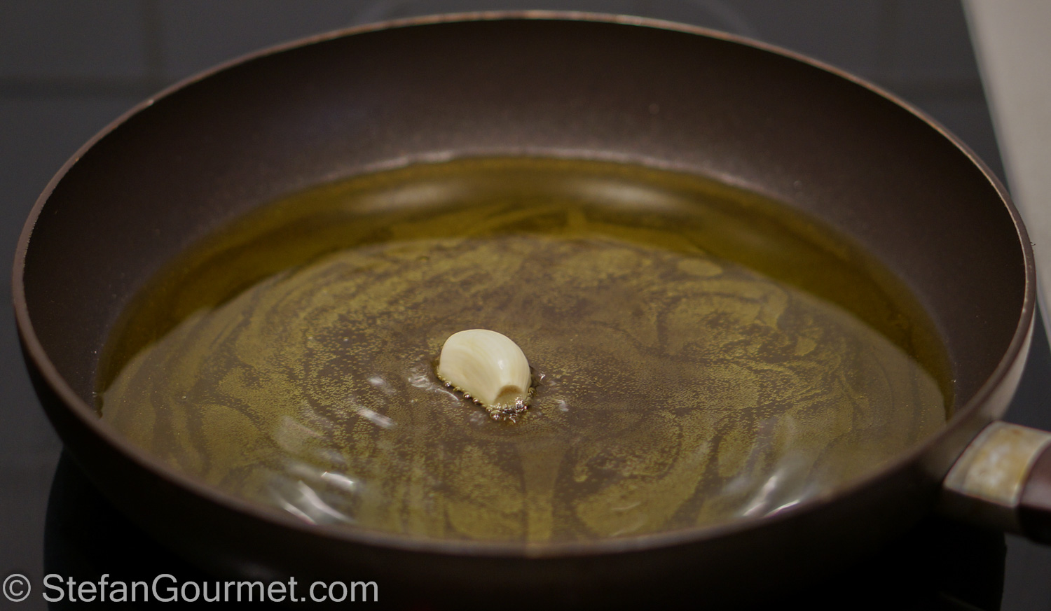 Heat the oil in a non-stick frying pan and add the garlic clove, peeled only. Cook it until it’s golden, but don’t let it turn brown.