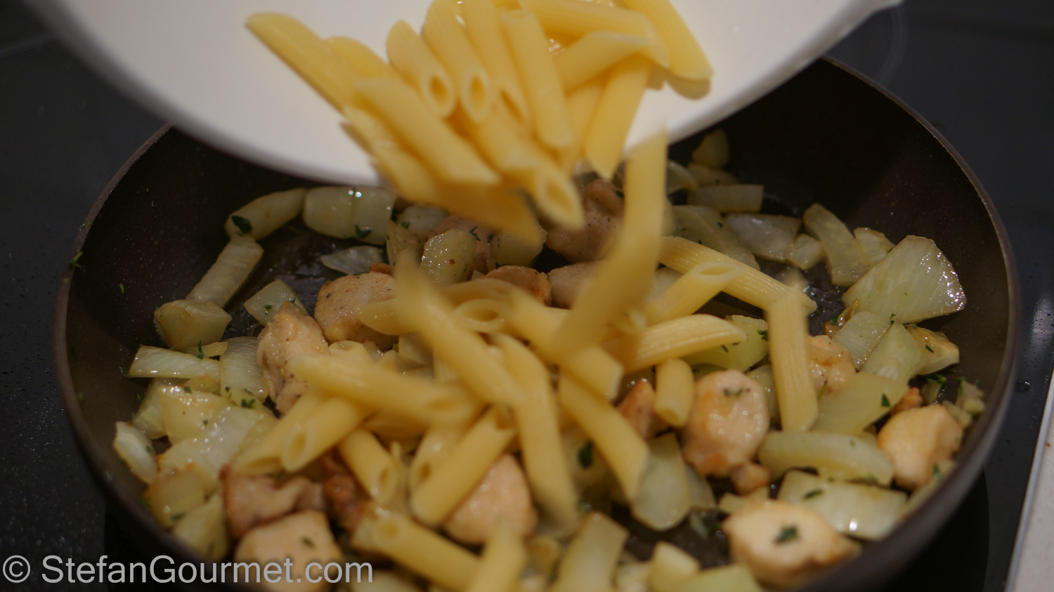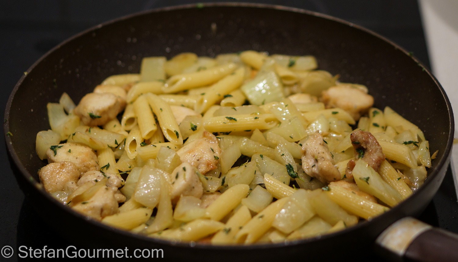 Drain the pasta when it’s al dente and add to the fennel and rabbit.