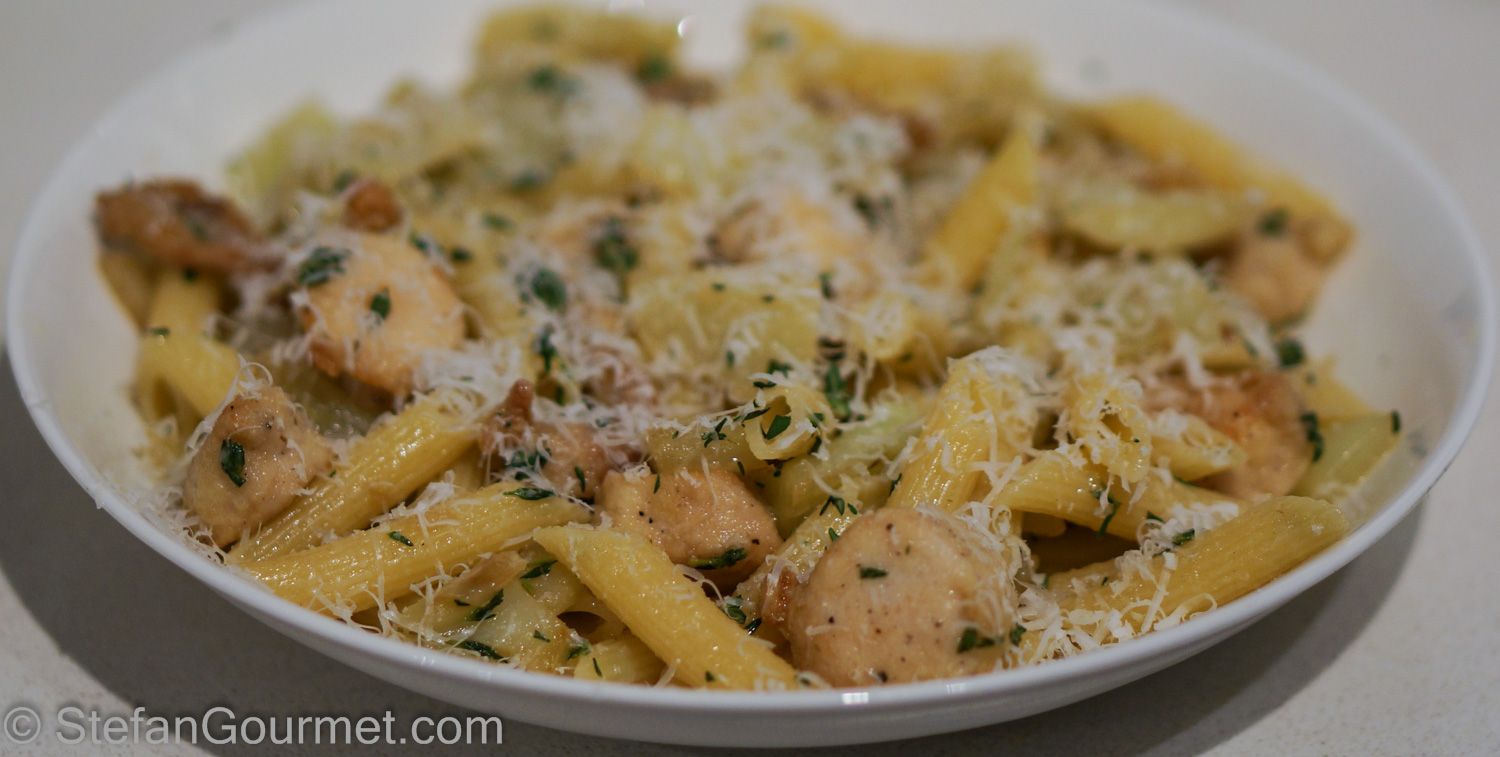 Many pasta dishes are great for a weeknight meal, as they take no longer to prepare than it takes to cook the pasta. This is another example of such a dish, not a classic Italian recipe but something that came around from what I had in my refrigerator. The combination of fennel and rabbit worked out nicely. Rabbit loin is very tender and has a nice subtle flavor to it. Dusting the rabbit pieces with semolina flour provides a nice crust. If it is unlikely that you encounter rabbit loin in your refrigerator, you could always substitute with bonesless and skinless chicken (thighs or breast). Here’s what I did.