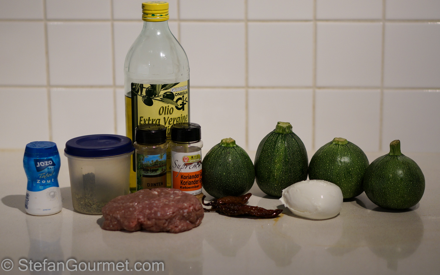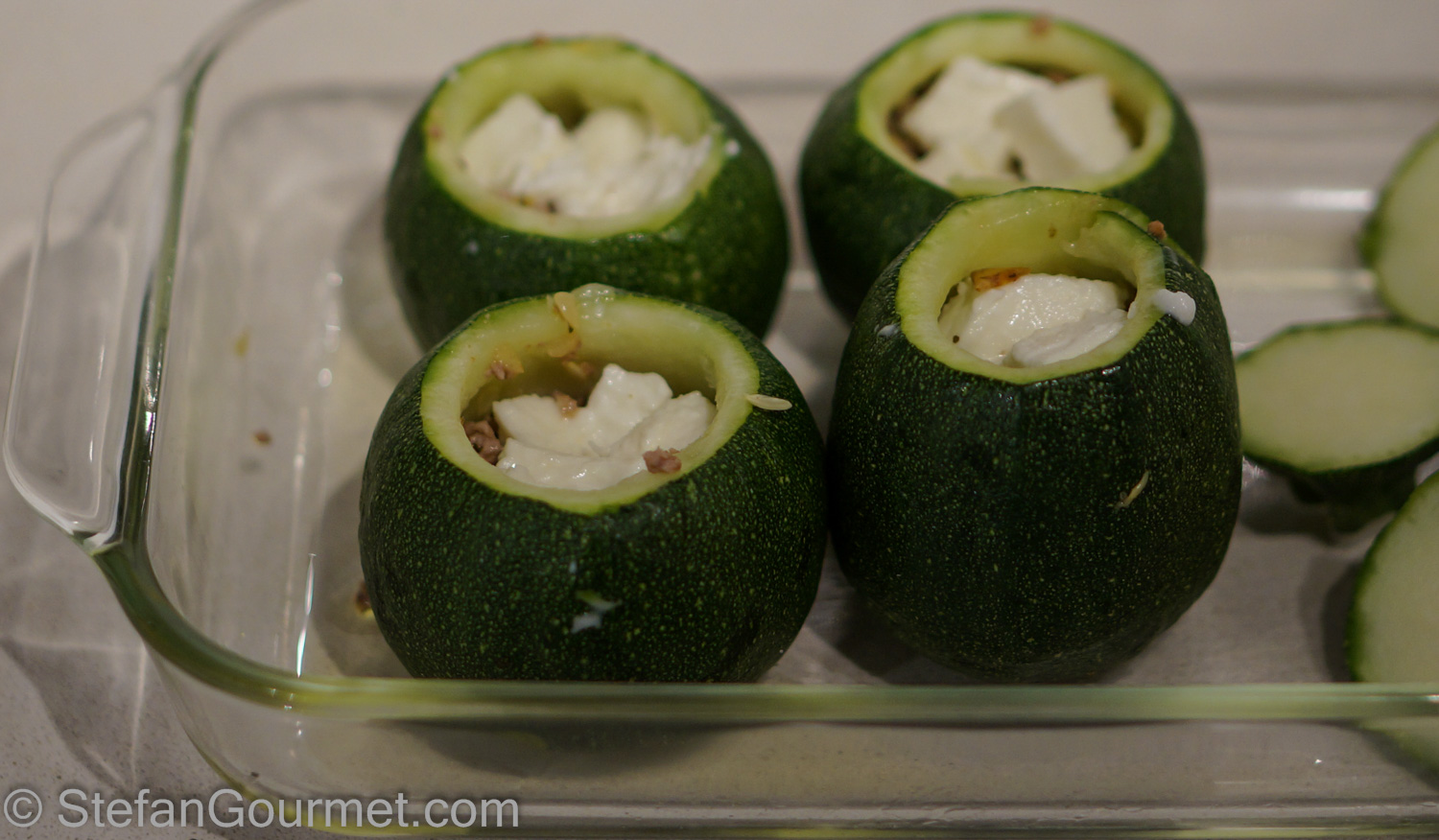 Preheat the oven to 200ºC/400ºF. Grease an oven proof dish with some olive oil. Lightly brush the zucchini with olive oil on the outside and season lightly with salt on the inside. Lightly brush the zucchini caps with olive oil as well. Arrange the zucchini in the oven proof dish.