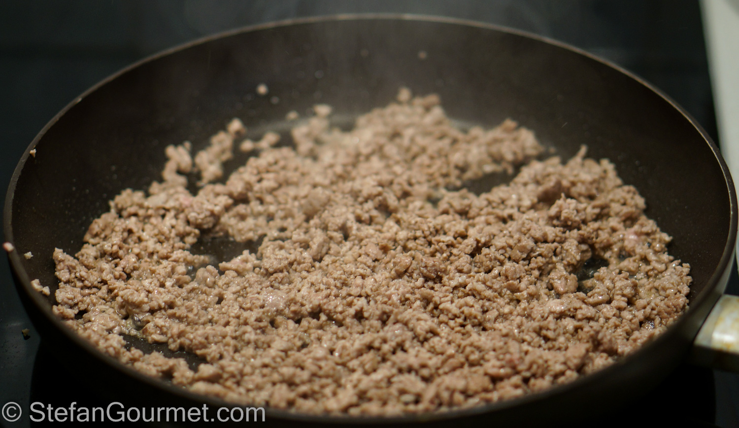 Meanwhile, cook the ground pork in a non-stick pan (no oil required as the meat will release its own fat), using two wooden spatulas to break up the meat.