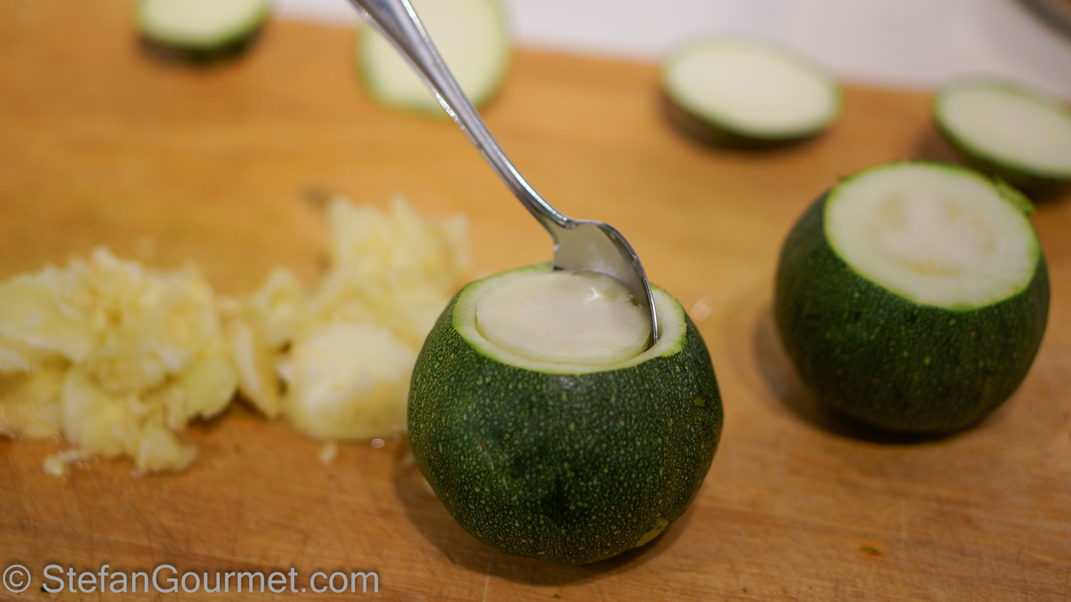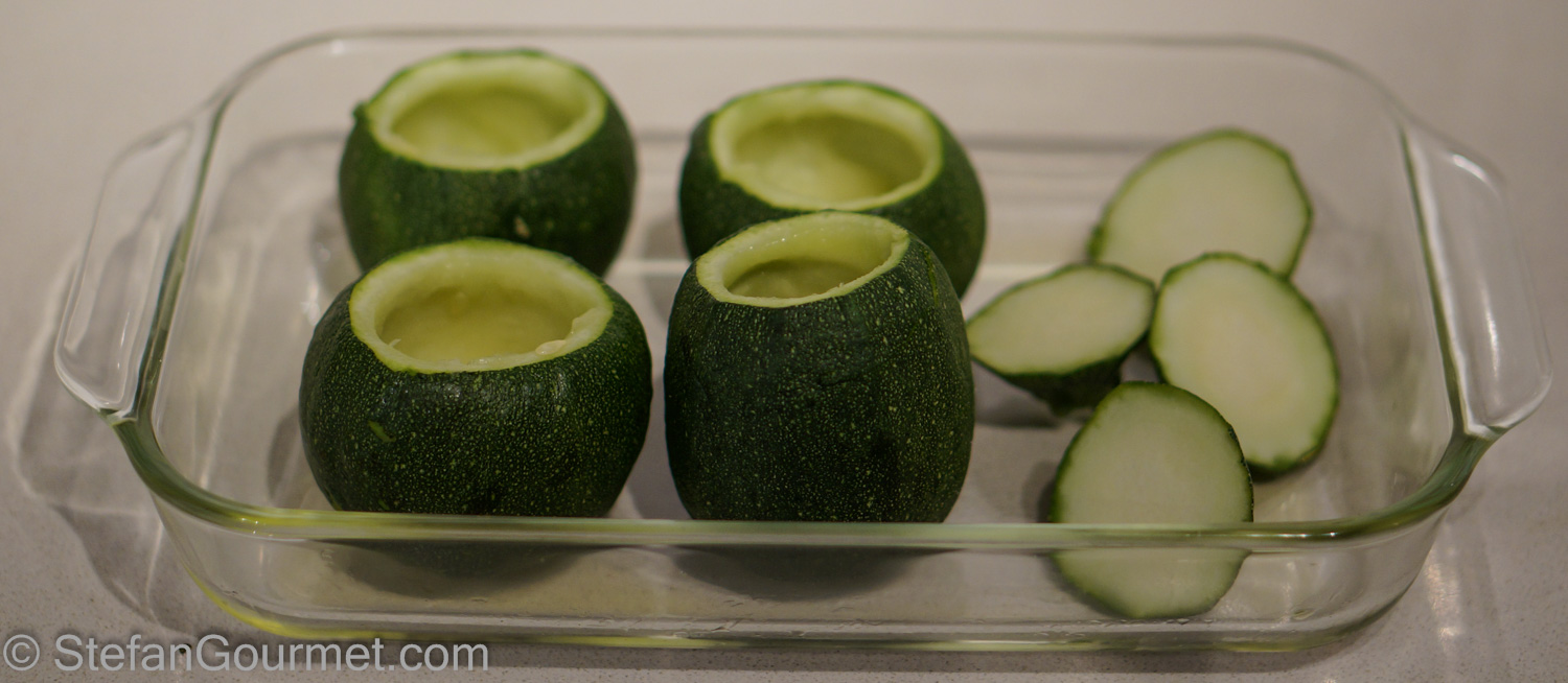 By now the zucchini should be parcooked and cooled off just a little so you can handle them. Cut off the cap and scoop out the interior flesh and seeds.
