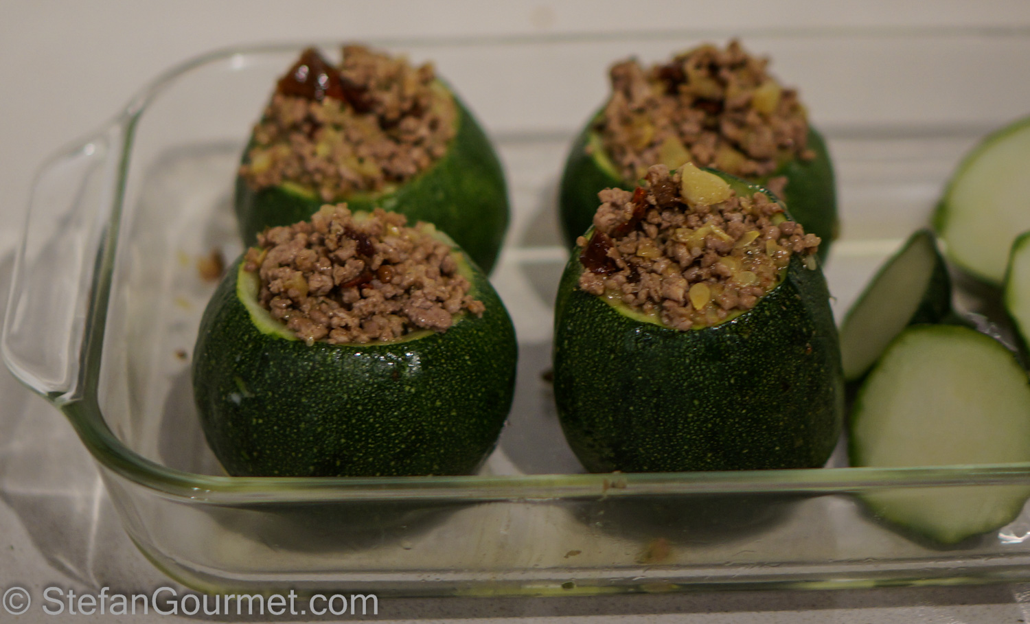 Stuff the zucchini with half of the meat mixture, pressing down on the meat to get as much in there as you can.