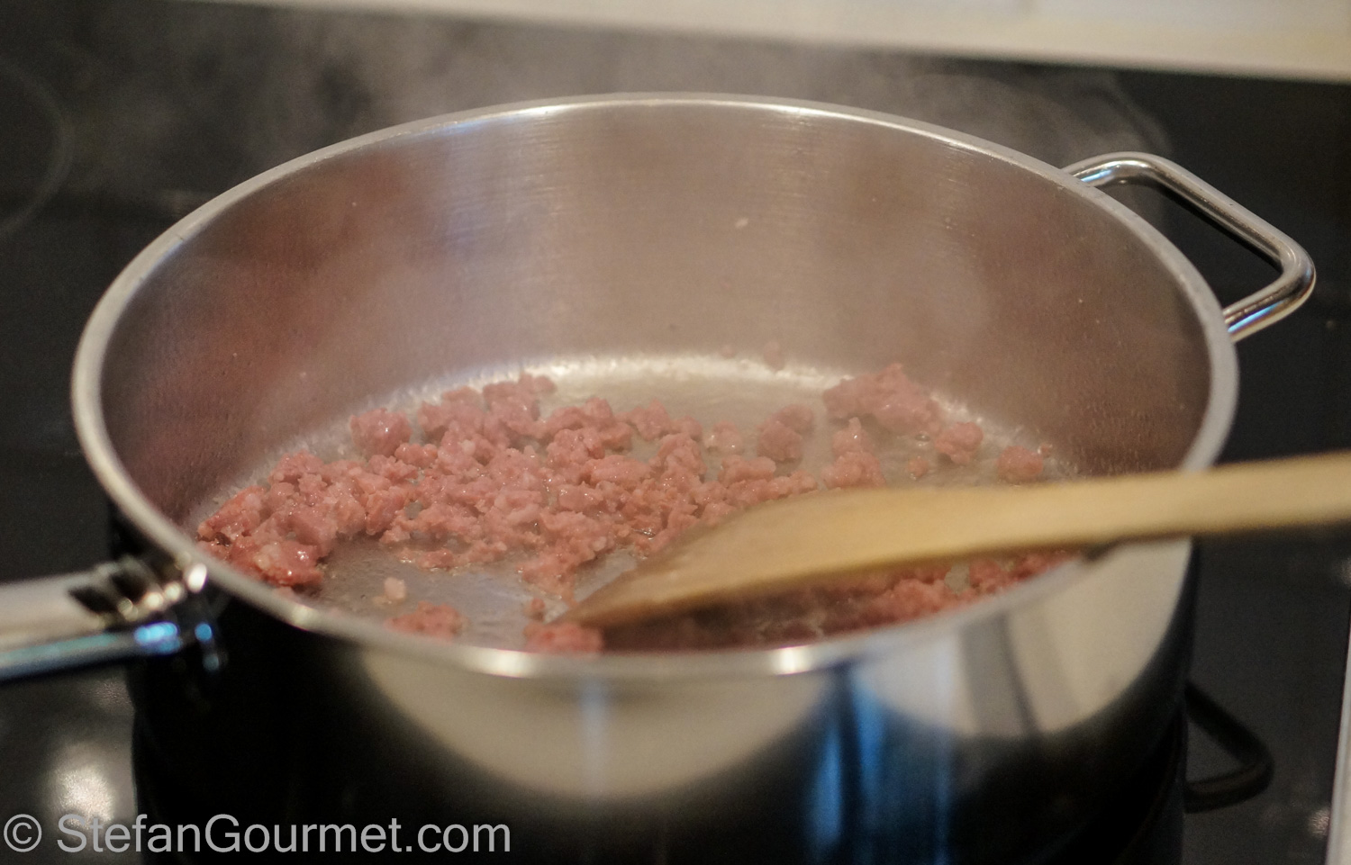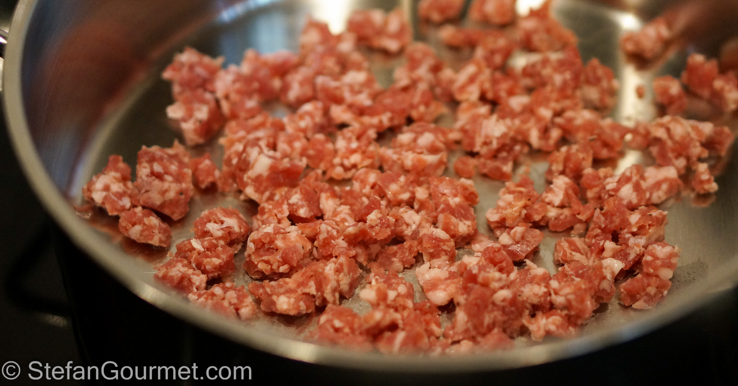 Put the sausage meat in a frying pan over medium high heat. No oil is needed as the sausage is fatty enough of its own.