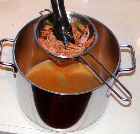 Use a ‘chinois’ (pointy metal colander as shown) and a pestle to filter the stock and get as much juice out of the shrimp heads as possible.