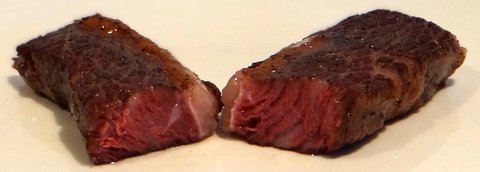 Two years ago I compared pan-seared wagyu flank steak with the same wagyu flank steak cooked sous-vide first and then seared. Wagyu flank steak cooked 48 hours at 55ºC/131ºF first is still pink, but turned out to be much more tender than the steak that is simply seared.