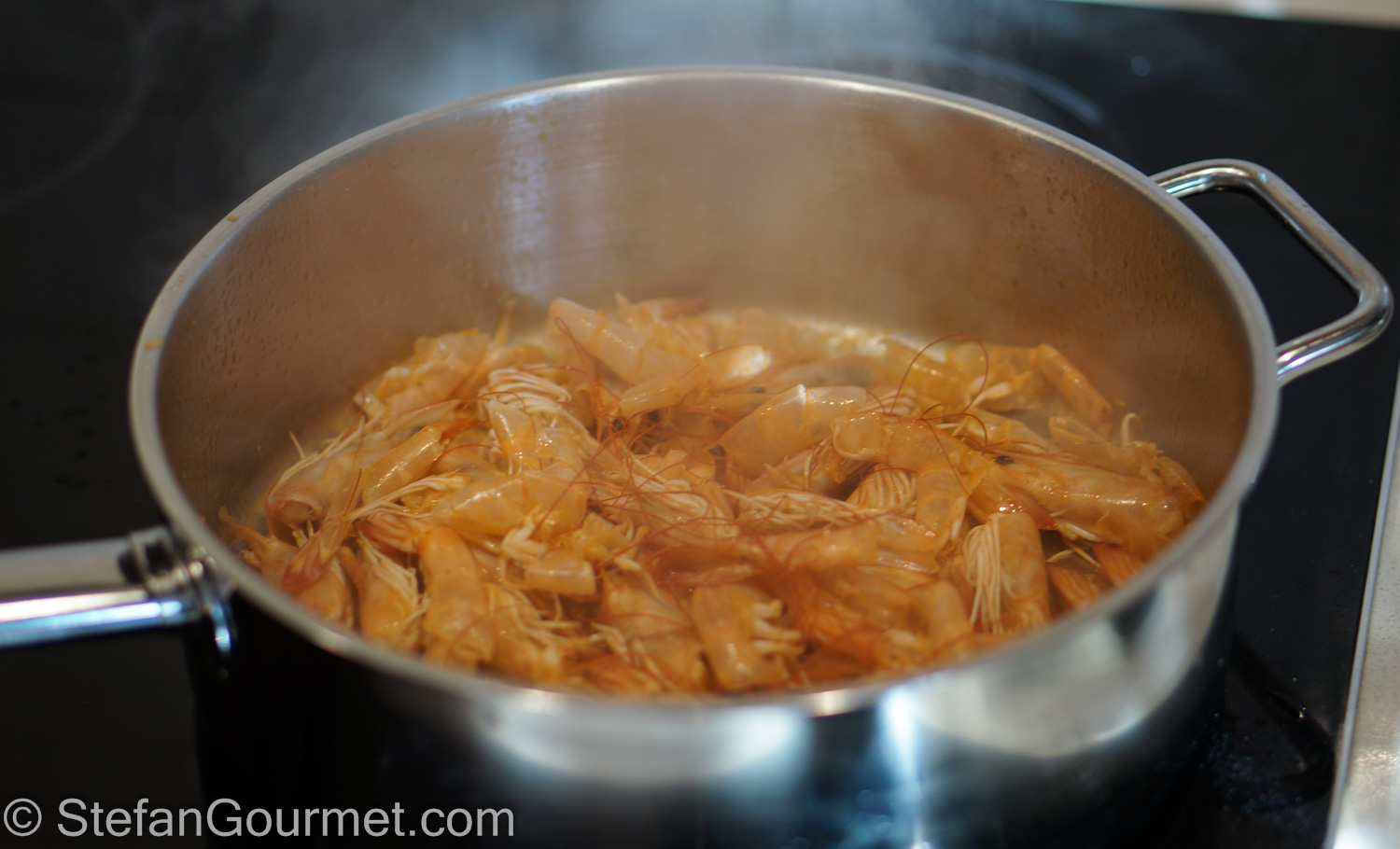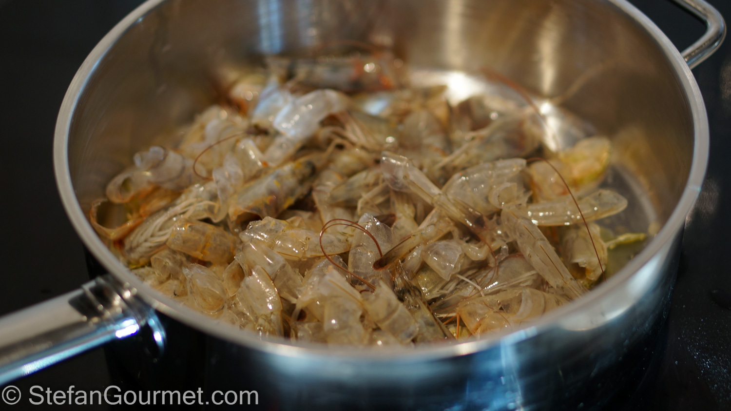 Start by making the shrimp syrup. Peel the shrimps, reserving the heads and shells. You should end up with about 250 grams (9 oz) of shrimp meat. Refrigerate the shrimp meat. Heat 1 Tbsp olive oil in a frying pan and add the heads and shells.