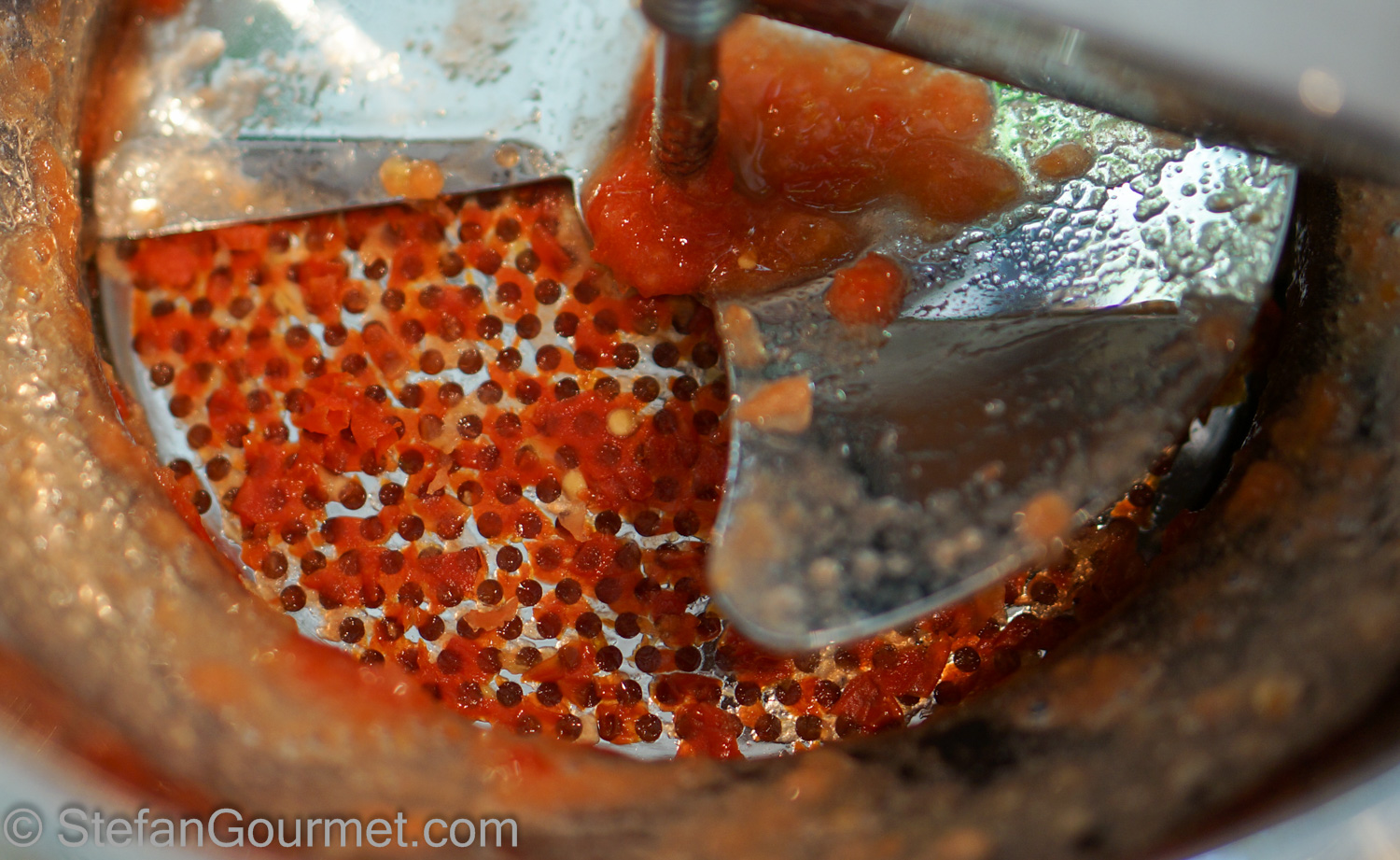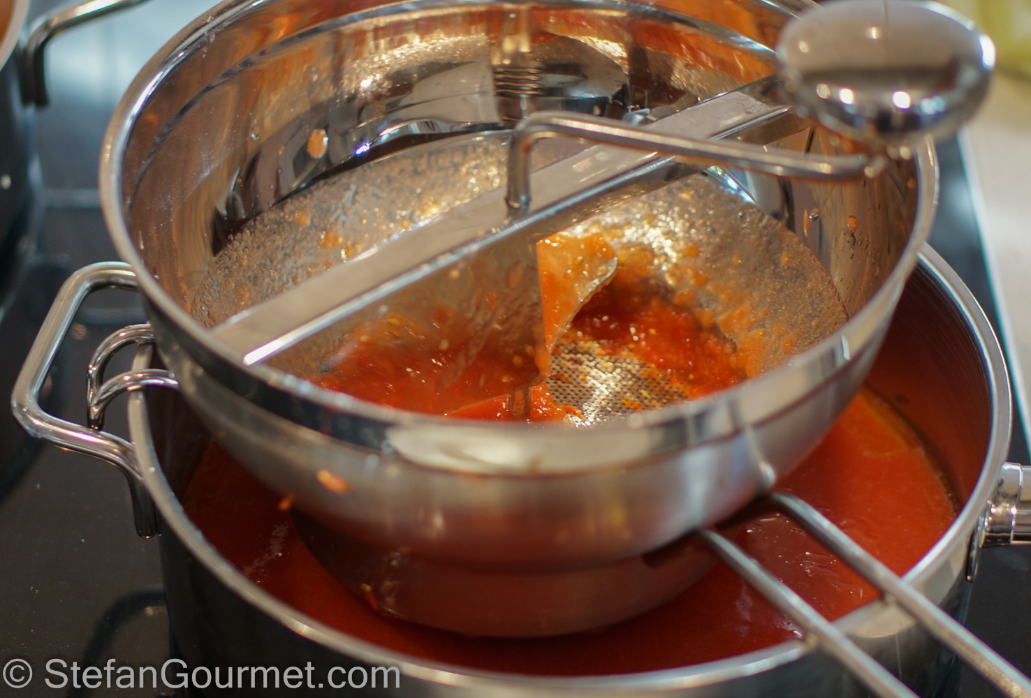 Use a foodmill fitted with the fine disc to add the tomatoes to the garlic-infused butter.