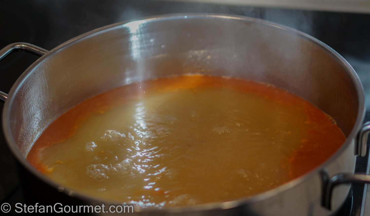 Put the shrimp stock in a wide shallow pan. Bring to a boil, then reduce to a simmer.