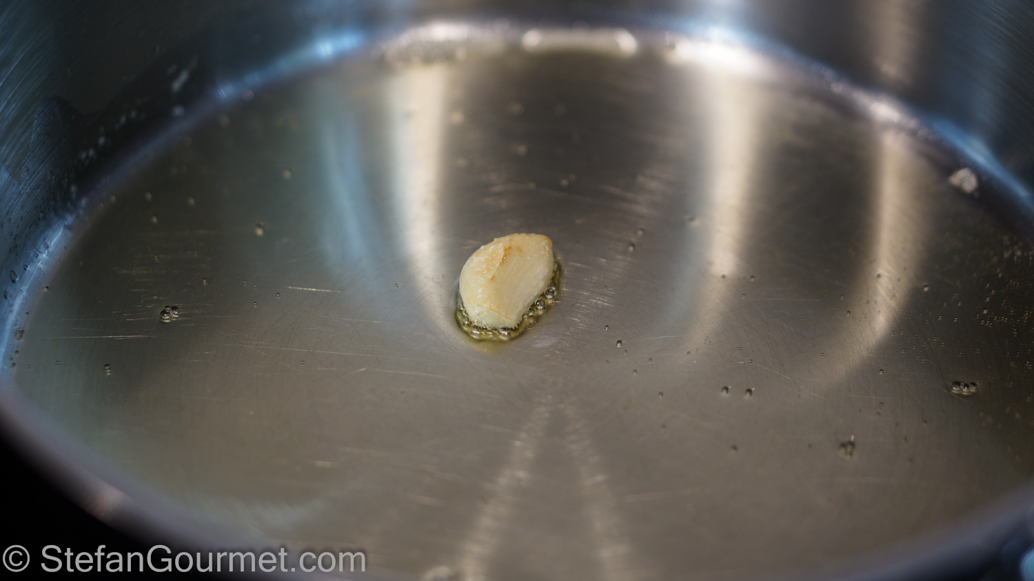 Melt the butter in a frying pan. Add the garlic clove and cook it until it is golden on all sides. Regulate the heat so you don’t burn the butter (or the garlic). This is easier with clarified butter. Discard the garlic.