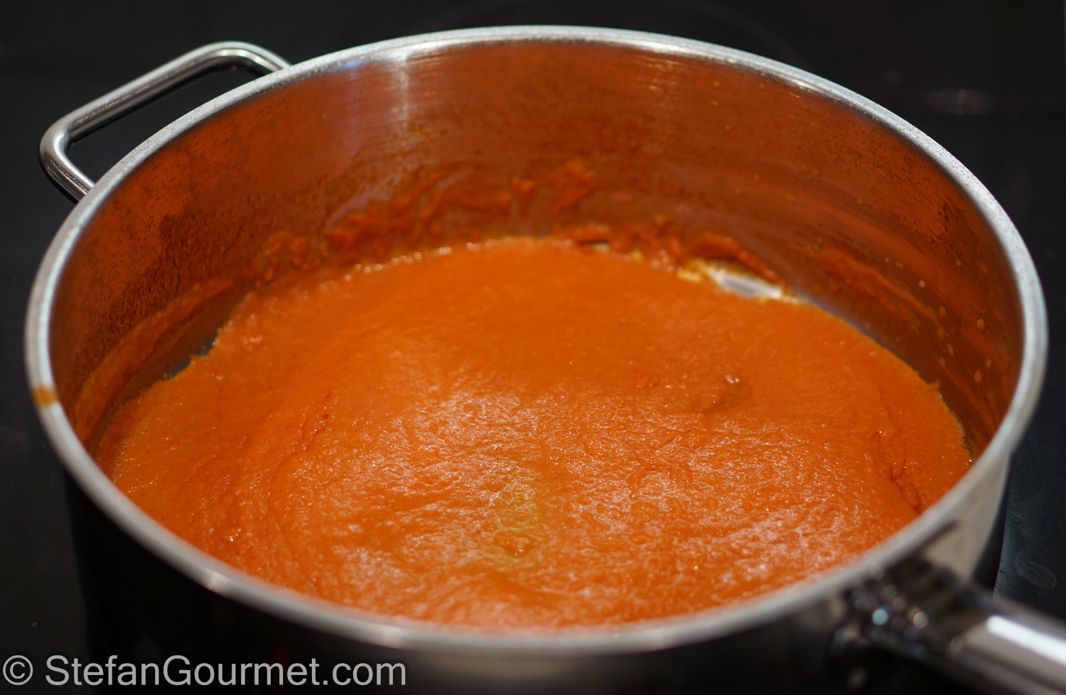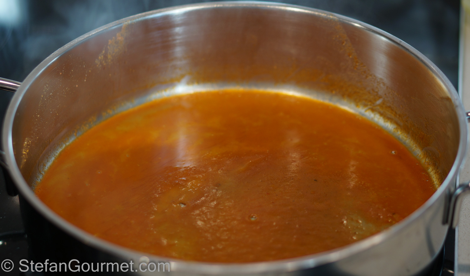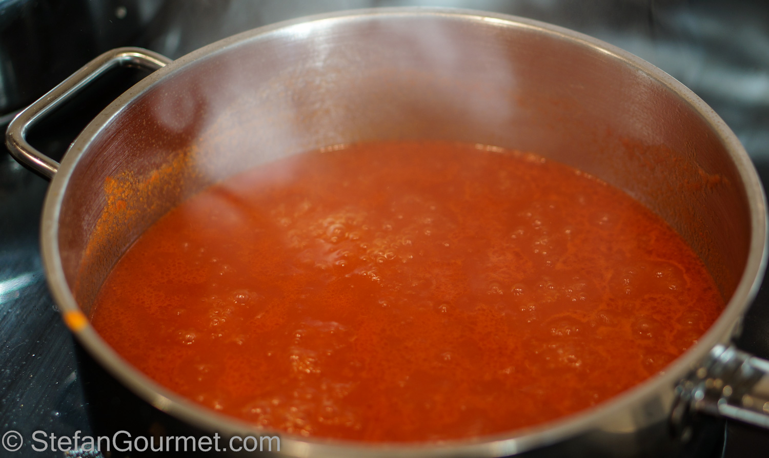 Bring to a boil, and then reduce the heat to a simmer. Allow to simmer over low heat until the sauce is no longer watery.